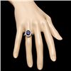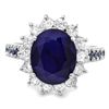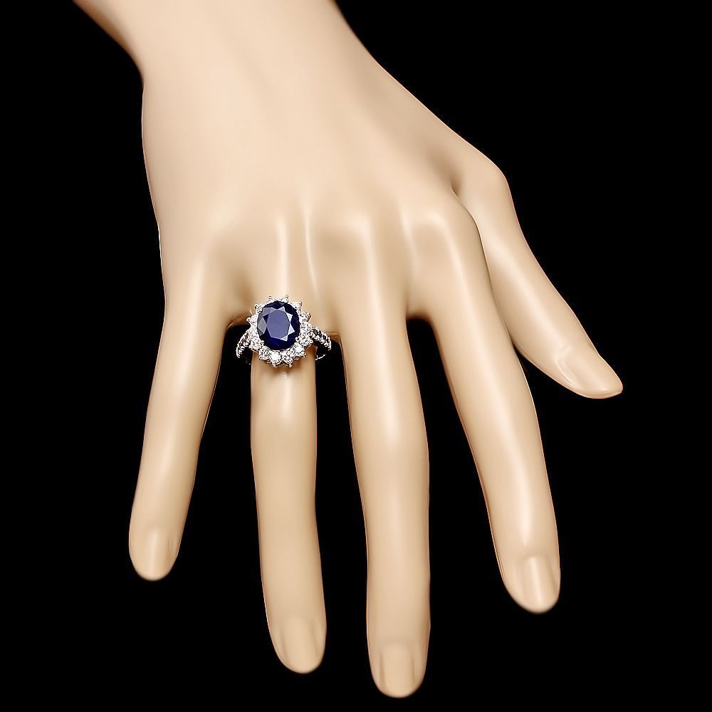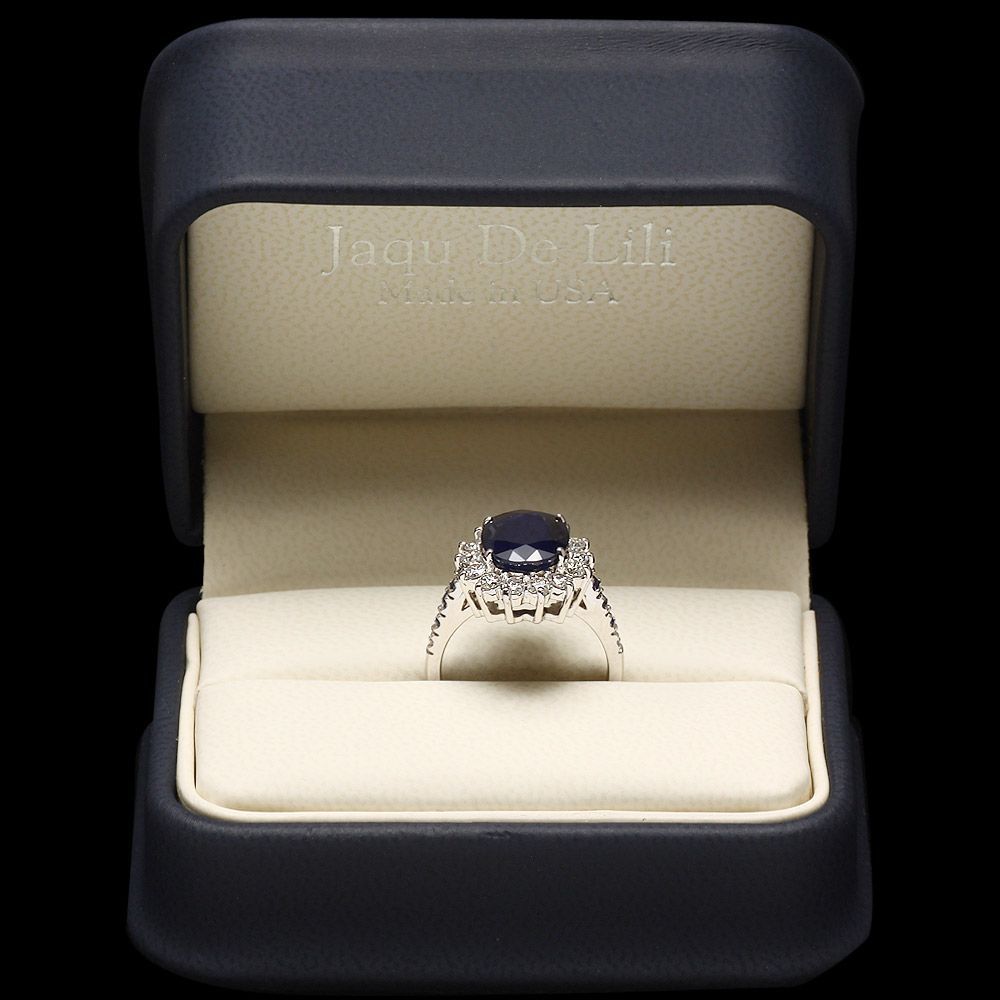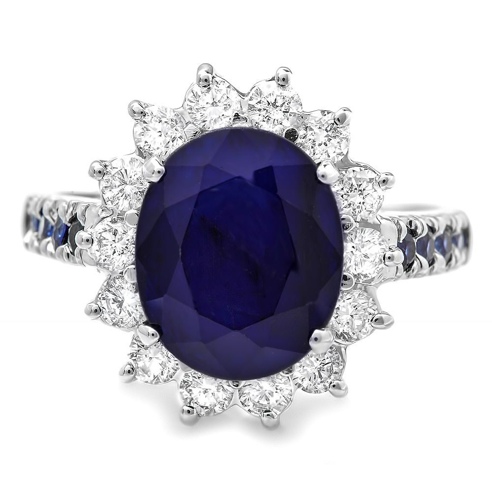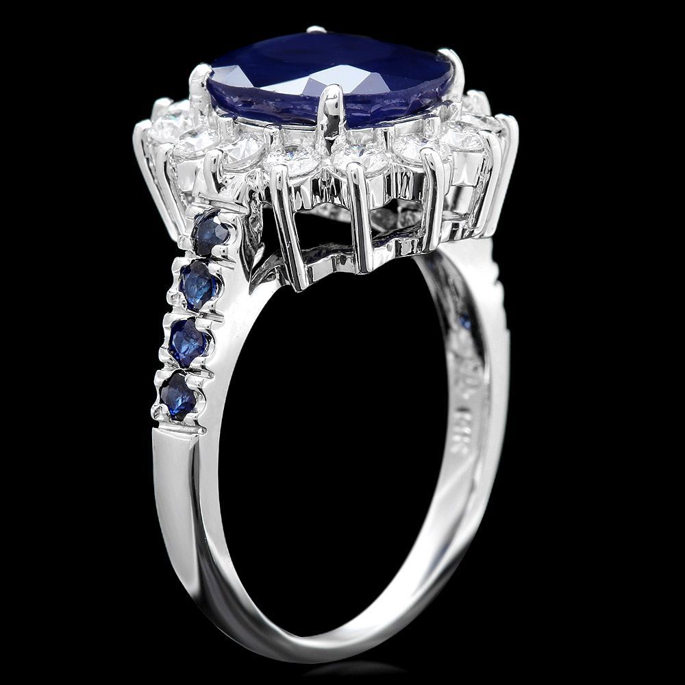 This luxurious ladies ring is crafted in solid 14k White Gold and features a 4.00 carat Natural Sapphire mined from Sri Lanka + accented with 14 sparkling eye-clean natural Diamonds, totaling 0.80 carats and 8 natural Sapphires, totaling 0.30 carats. Excellent craftsmanship. Made in USA.