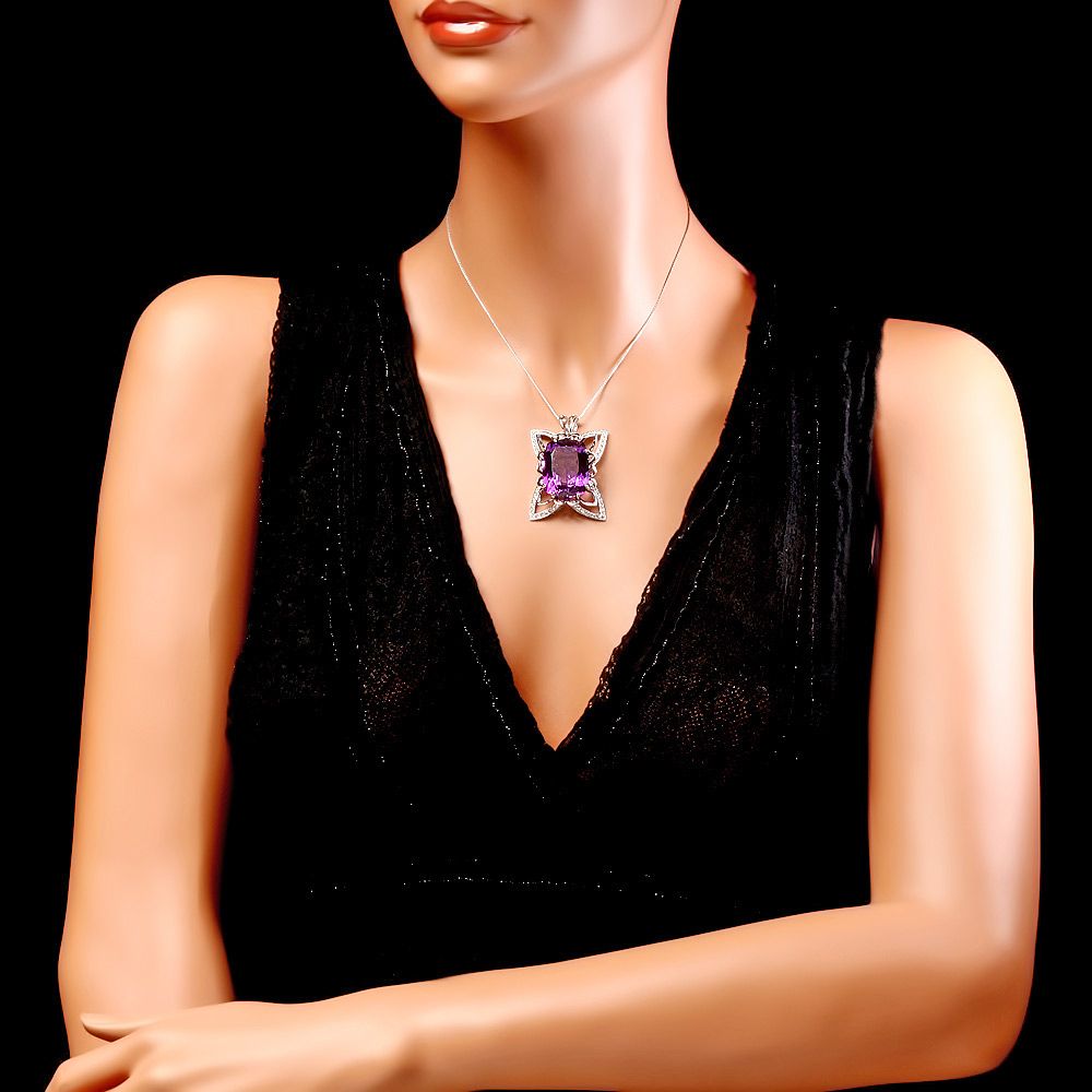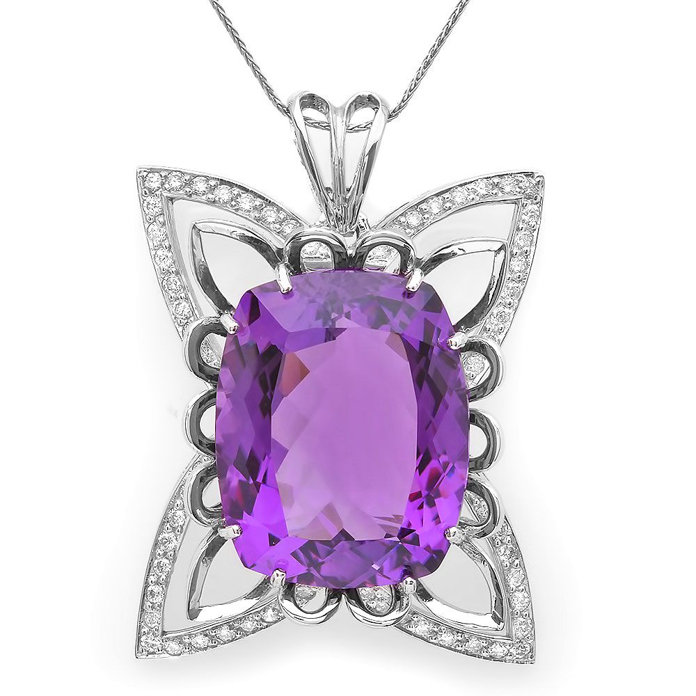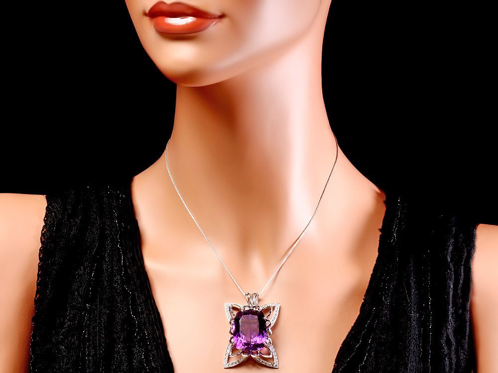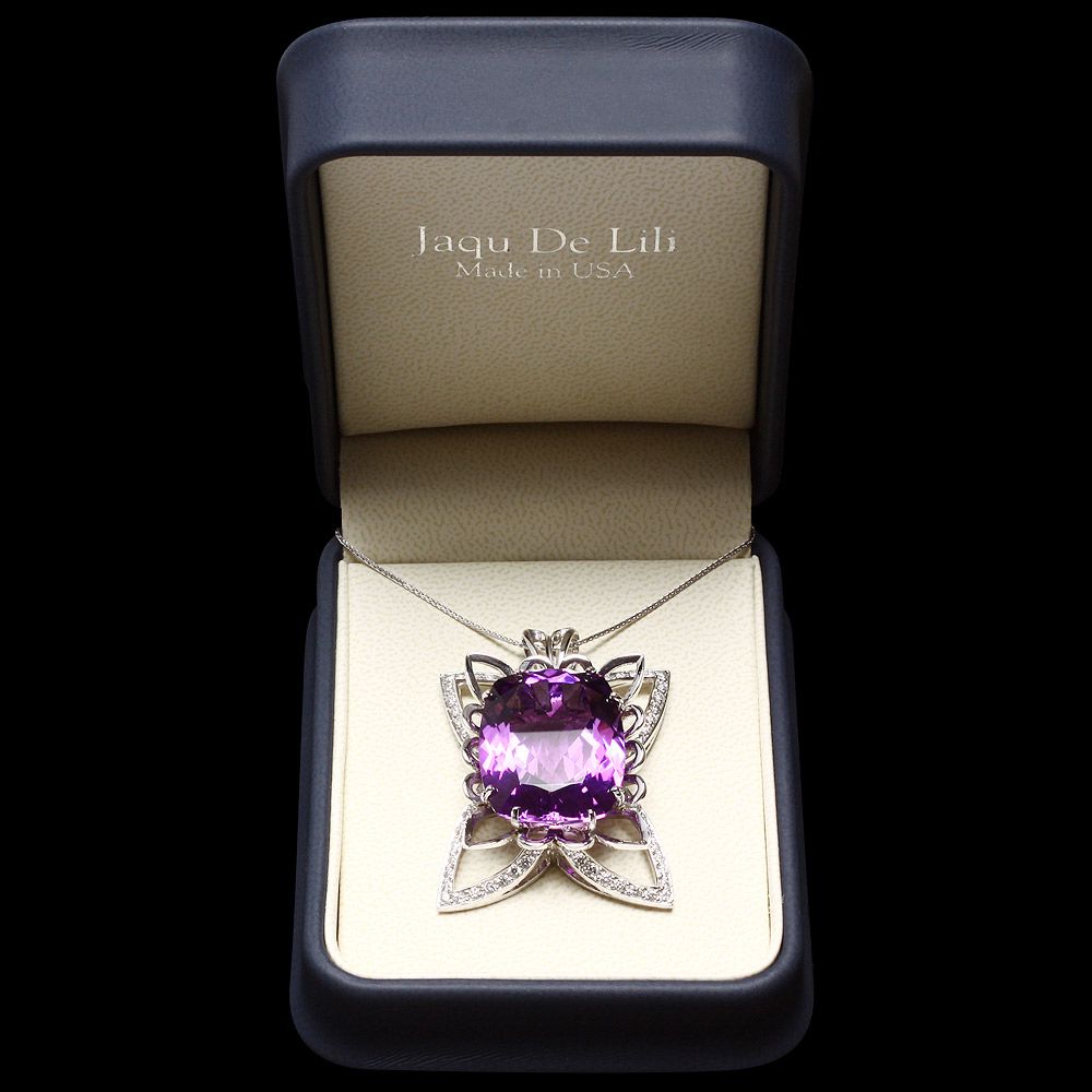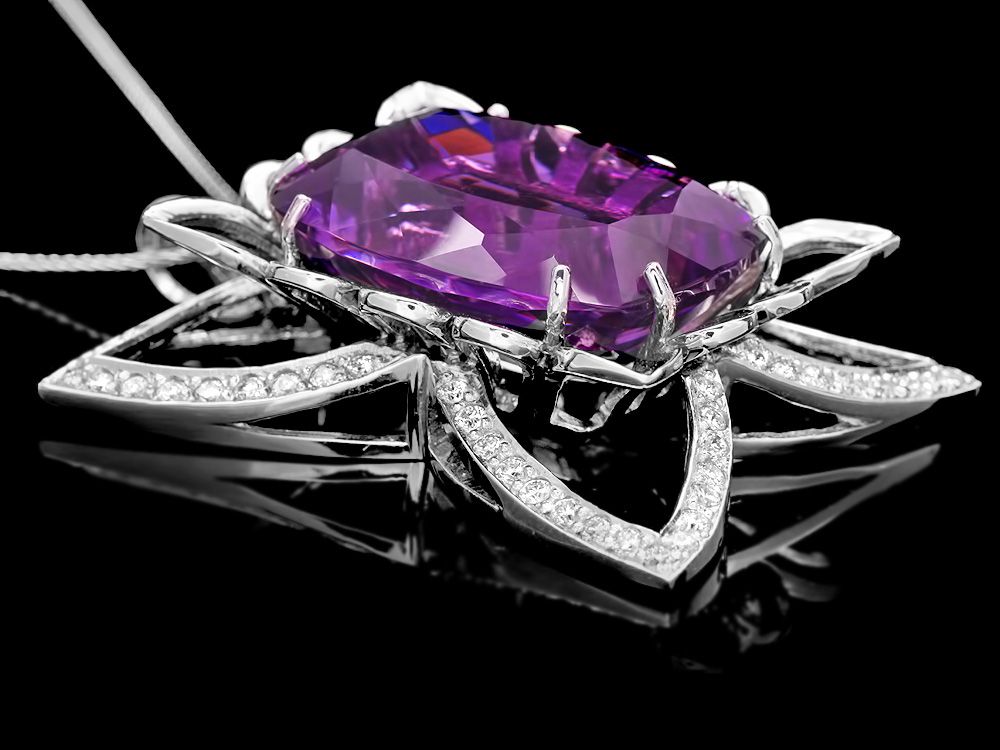 Retail: $18900.00 ****** Metal: 14k Solid White Gold / Size: 16 / Total Item Weight: 23.0 grams / Country Made: USA / / Main Stone: Amethyst / Color: Purple / Carat Total Weight: 40.00 / Treatment: None / Clarity: Type 2 / Cut: Very Good / / Secondary Stone: Diamond / Carat Total Weight: 1.45 / Treatment: None / Color Grade: G - H / Clarity: SI1 - SI2 / Cut: Very Good / ****** Ref: JQL-N-6902