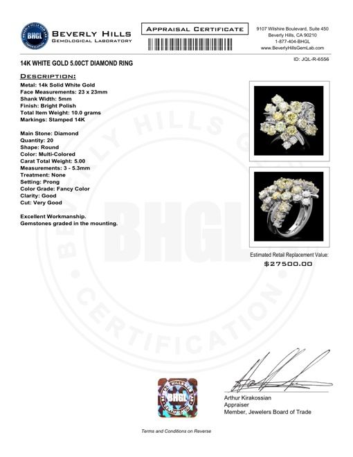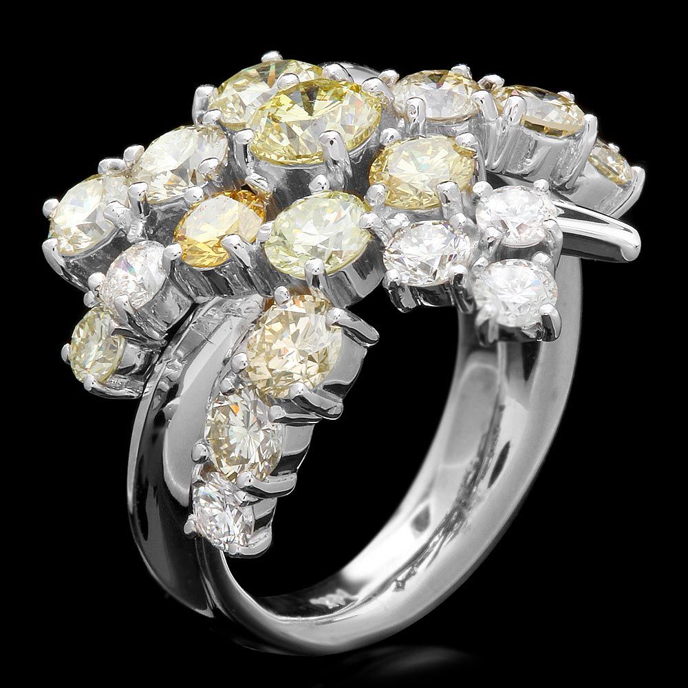 Retail: $27500.00 ****** Metal: 14k Solid White Gold / Size: 6.5 / Total Item Weight: 10.0 grams / Country Made: USA / / Main Stone: Diamond / Color: Multi-Colored / Carat Total Weight: 5.00 / Treatment: None / Color Grade: Fancy Color / Clarity: Good / Cut: Very Good / ****** Ref: JQL-R-6556