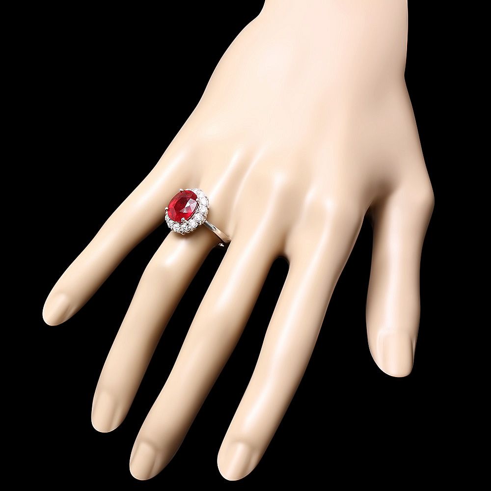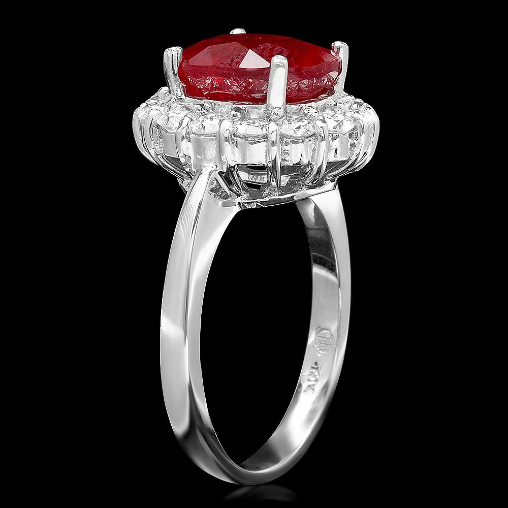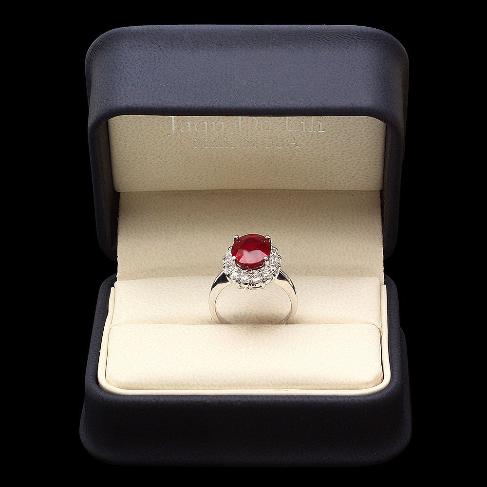 Retail: $6000.00 ****** Metal: 14k Solid White Gold / Size: 7.25 / Total Item Weight: 6 grams / Country Made: USA / / Main Stone: Ruby / Color: Red / Carat Total Weight: 5.00 / Treatment: Filling / Clarity: Type 2 / Cut: Very Good / / Secondary Stone: Diamond / Carat Total Weight: 0.90 / Treatment: None / Color Grade: H - I / Clarity: SI1 - SI2 / Cut: Very Good / ****** Ref: JQL-R-4902