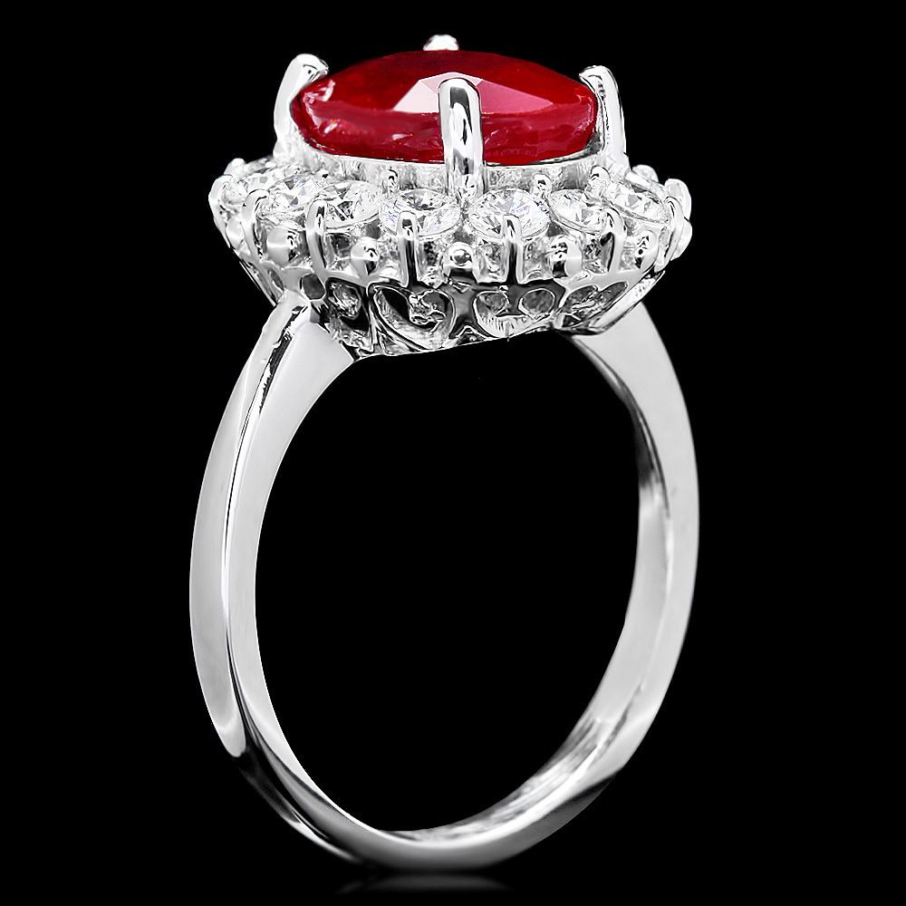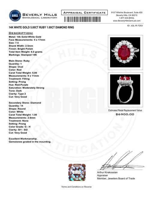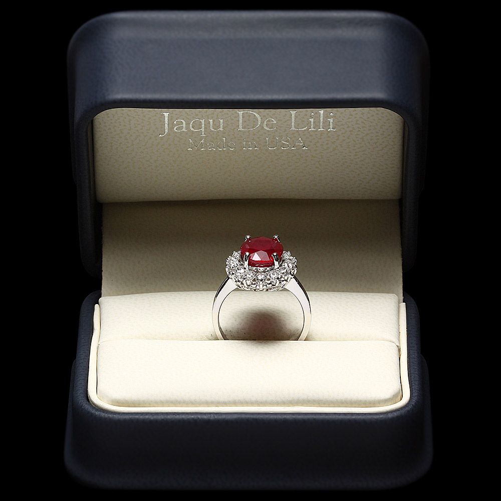 Retail: $6900.00 ****** Metal: 14k Solid White Gold / Size: 7.5 / Total Item Weight: 6.0 grams / Country Made: USA / / Main Stone: Ruby / Color: Red / Carat Total Weight: 5.00 / Treatment: Filling / Clarity: Type 2 / Cut: Very Good / / Secondary Stone: Diamond / Carat Total Weight: 1.00 / Treatment: None / Color Grade: G - H / Clarity: SI1 - SI2 / Cut: Very Good / ****** Ref: JQL-R-7253