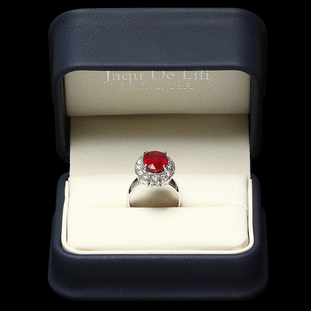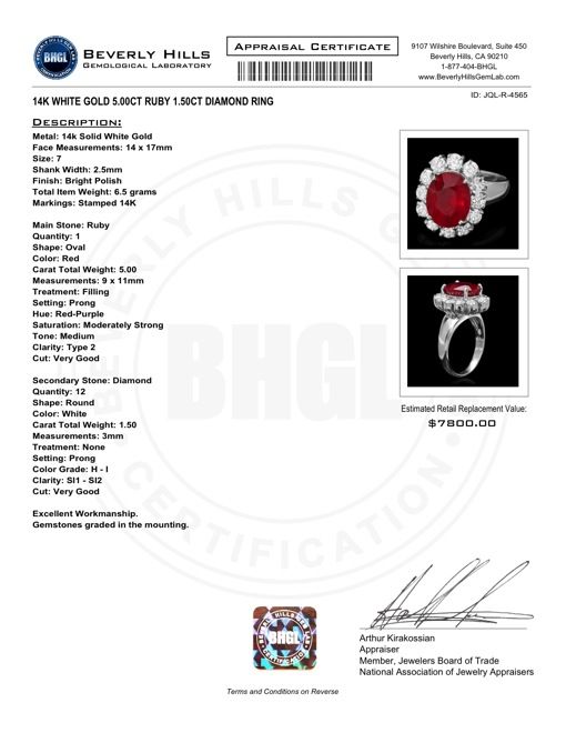 Retail: $7800.00 ****** Metal: 14k Solid White Gold / Size: 7 / Total Item Weight: 6.5 grams / Country Made: USA / / Main Stone: Ruby / Color: Red / Carat Total Weight: 5.00 / Treatment: Filling / Clarity: Type 2 / Cut: Very Good / / Secondary Stone: Diamond / Carat Total Weight: 1.50 / Treatment: None / Color Grade: H - I / Clarity: SI1 - SI2 / Cut: Very Good / ****** Ref: JQL-R-4565