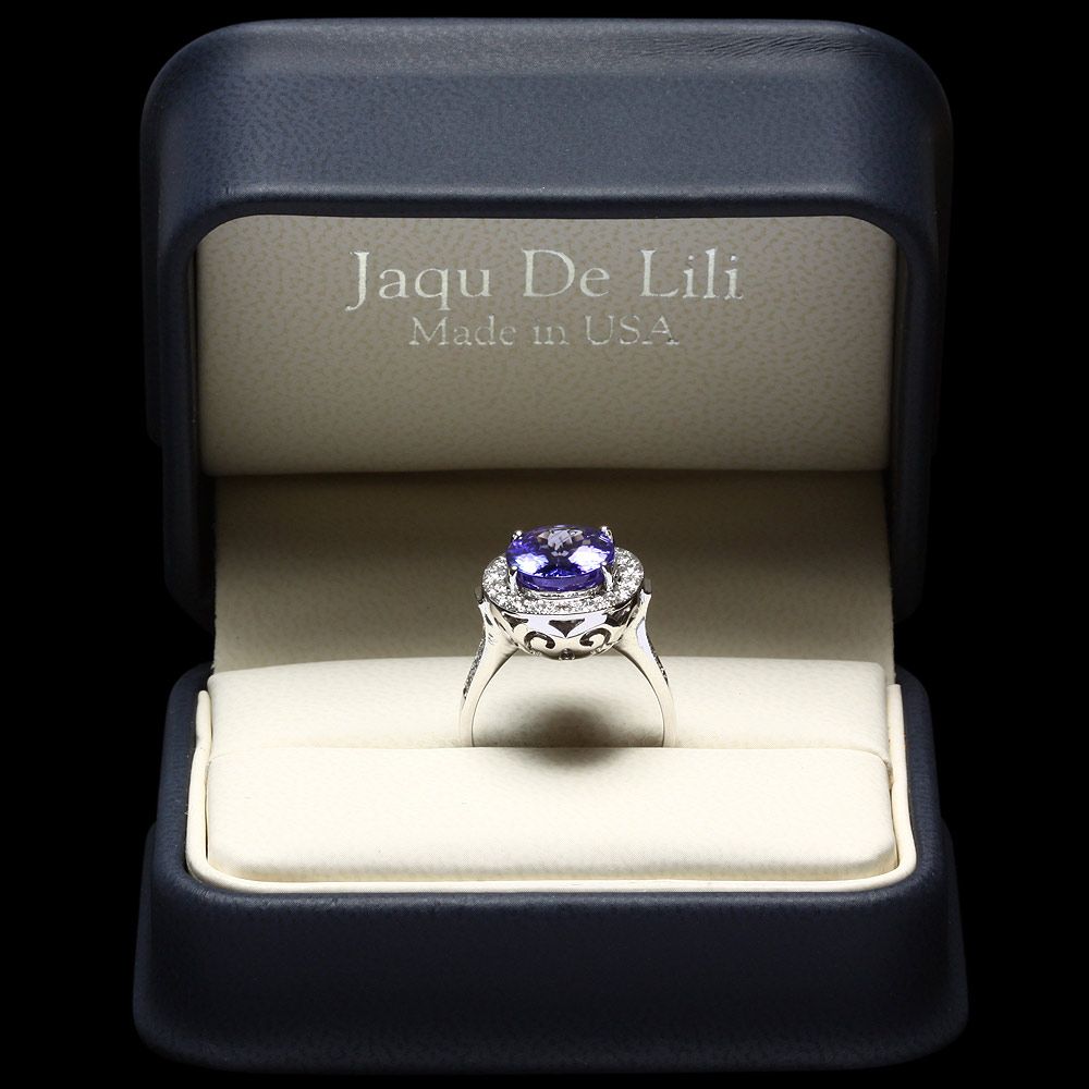 Retail: $13500.00 ****** Metal: 14k Solid White Gold / Size: 7.5 / Total Item Weight: 6.5 grams / Country Made: USA / / Main Stone: Tanzanite / Color: Purple / Carat Total Weight: 5.00 / Treatment: None / Clarity: Type 2 / Cut: Very Good / / Secondary Stone: Diamond / Carat Total Weight: 0.70 / Treatment: None / Color Grade: G - H / Clarity: SI1 - SI2 / Cut: Very Good / ****** Ref: JQL-R-7448
