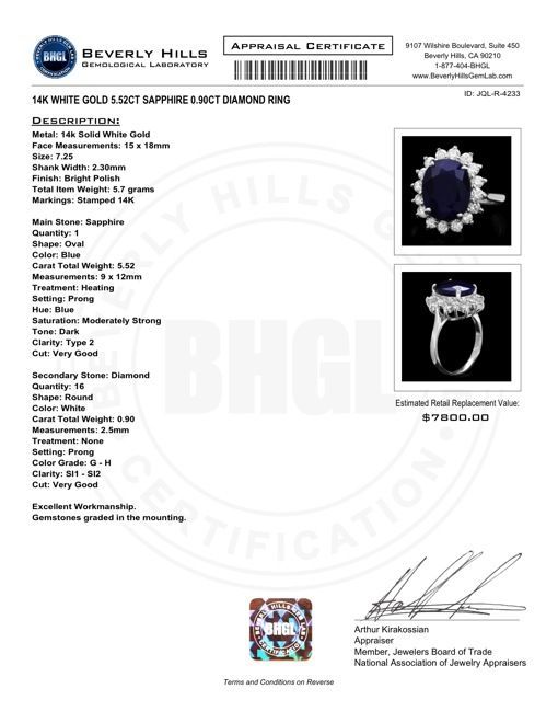 Regarding Appraised Jewelry and Loose Stones - WESTBURY AUCTION GALLERIES sends them out to a third party for Retail Replacement Value Appraisals, which are the most common. These types of evaluations are written for insurance needs. This would be the cost to replace the jewelry with an item of equal quality and kind, considered to be the current market price or the replacement value. This type of appraisal is done to protect you in the event of damage or loss of a valuable item. Our appraisals are conducted by independent 3rd Party appraisal firms that utilizes Certified GIA Gemologist. Appraisals should be used for verification of gemstone and/or metal weight, size, and grade only, not actual value. Appraisal value should be considered for insurance purposes only, not actual value, as price varies greatly from retail locations thru out the world. Items should not be purchased with the expectation to resell for appraisal price, or for profit.