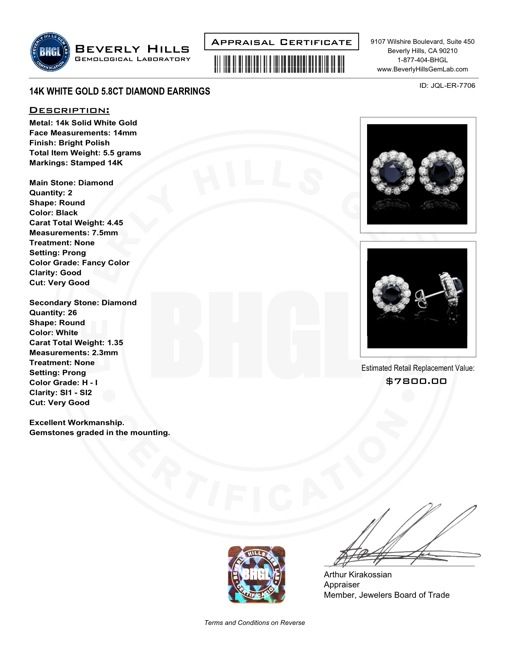 Retail: $7800.00 ****** Metal: 14k Solid White Gold / Total Item Weight: 5.5 grams / Country Made: USA / / Main Stone: Diamond / Color: Black / Carat Total Weight: 4.45 / Treatment: None / Color Grade: Fancy Color / Clarity: Good / Cut: Very Good / / Secondary Stone: Diamond / Carat Total Weight: 1.35 / Treatment: None / Color Grade: H - I / Clarity: SI1 - SI2 / Cut: Very Good / ****** Ref: JQL-ER-7706