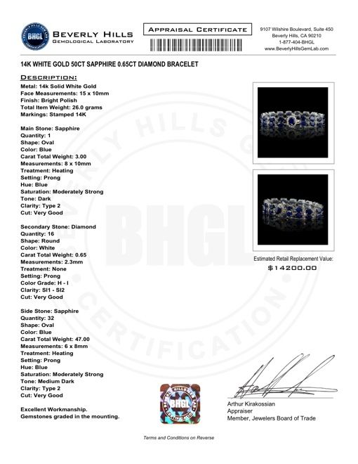Retail: $14200.00 ****** Metal: 14k Solid White Gold / Size: 7 / Total Item Weight: 26.0 grams / / Main Stone: Sapphire / Color: Blue / Carat Total Weight: 3.00 / Treatment: Heating / Clarity: Type 2 / Cut: Very Good / / Secondary Stone: Diamond / Carat Total Weight: 0.65 / Treatment: None / Color Grade: H - I / Clarity: SI1 - SI2 / Cut: Very Good / / Side Stone: Sapphire / Color: Blue / Carat Total Weight: 47.00 / Treatment: Heating / Clarity: Type 2 / Cut: Very Good / ****** Ref: JQL-BR-9568