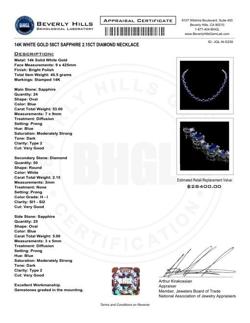 Regarding Appraised Jewelry and Loose Stones - WESTBURY AUCTION GALLERIES sends them out to a third party for Retail Replacement Value Appraisals, which are the most common. These types of evaluations are written for insurance needs. This would be the cost to replace the jewelry with an item of equal quality and kind, considered to be the current market price or the replacement value. This type of appraisal is done to protect you in the event of damage or loss of a valuable item. Our appraisals are conducted by independent 3rd Party appraisal firms that utilizes Certified GIA Gemologist. Appraisals should be used for verification of gemstone and/or metal weight, size, and grade only, not actual value. Appraisal value should be considered for insurance purposes only, not actual value, as price varies greatly from retail locations thru out the world. Items should not be purchased with the expectation to resell for appraisal price, or for profit.