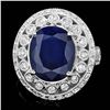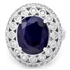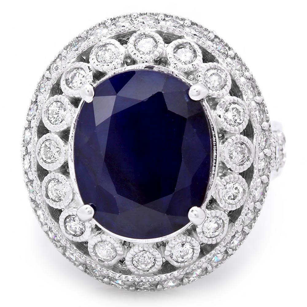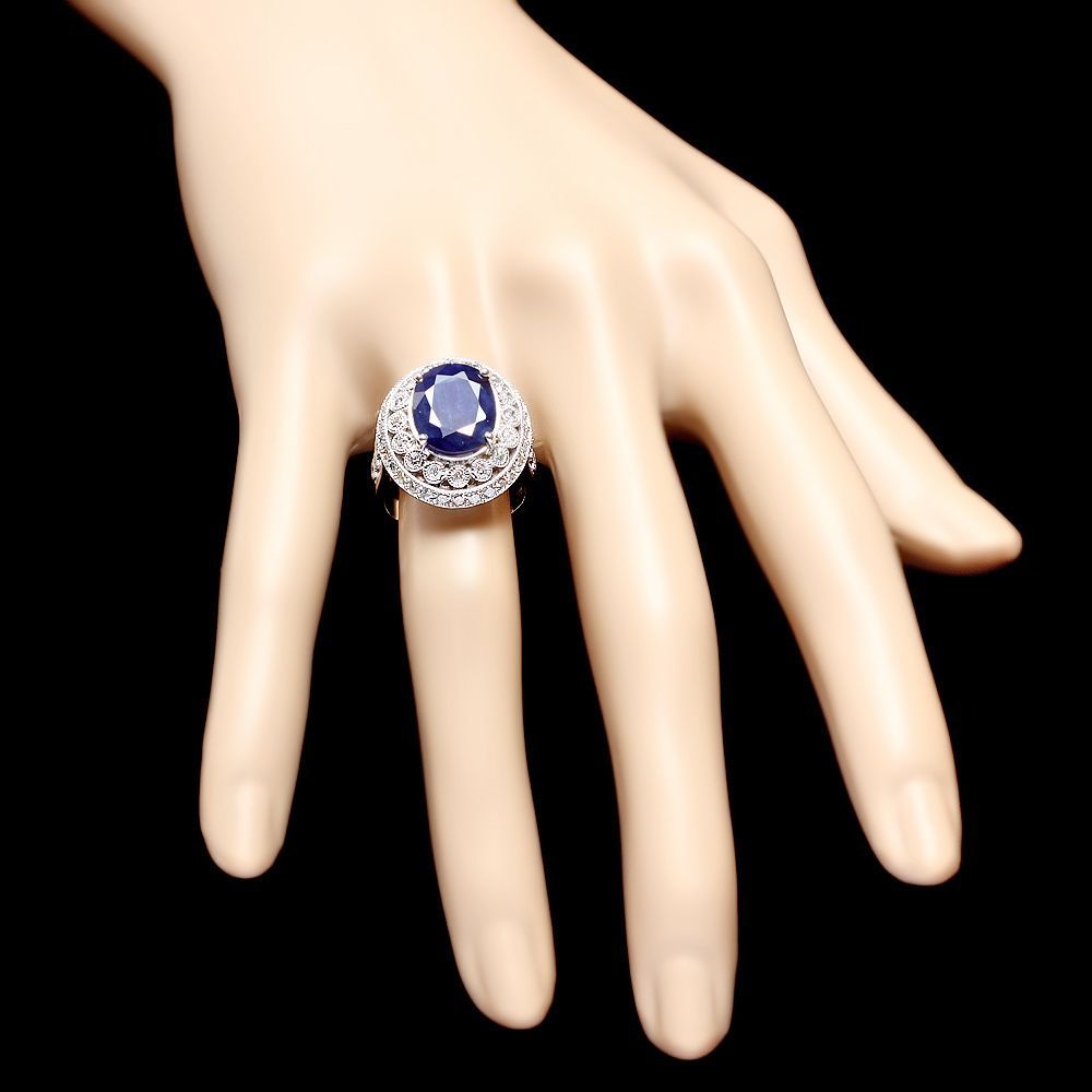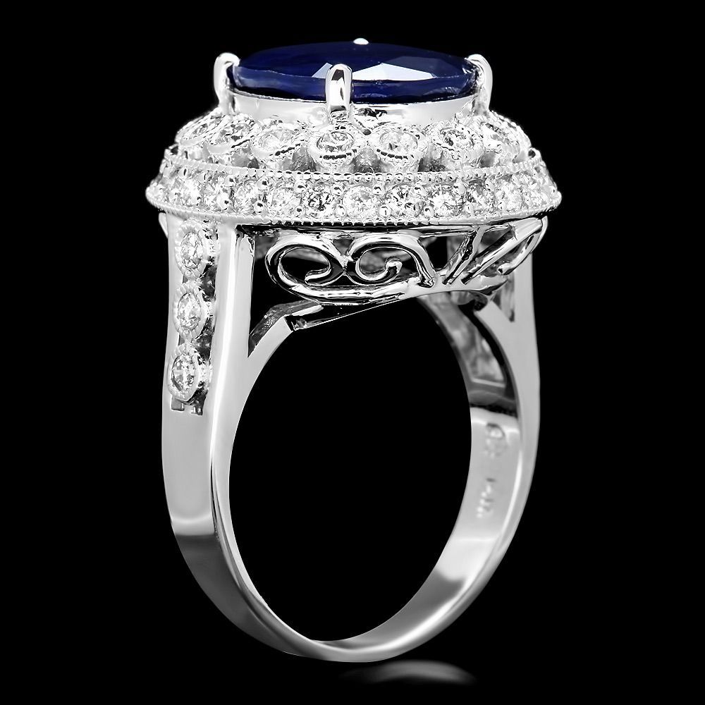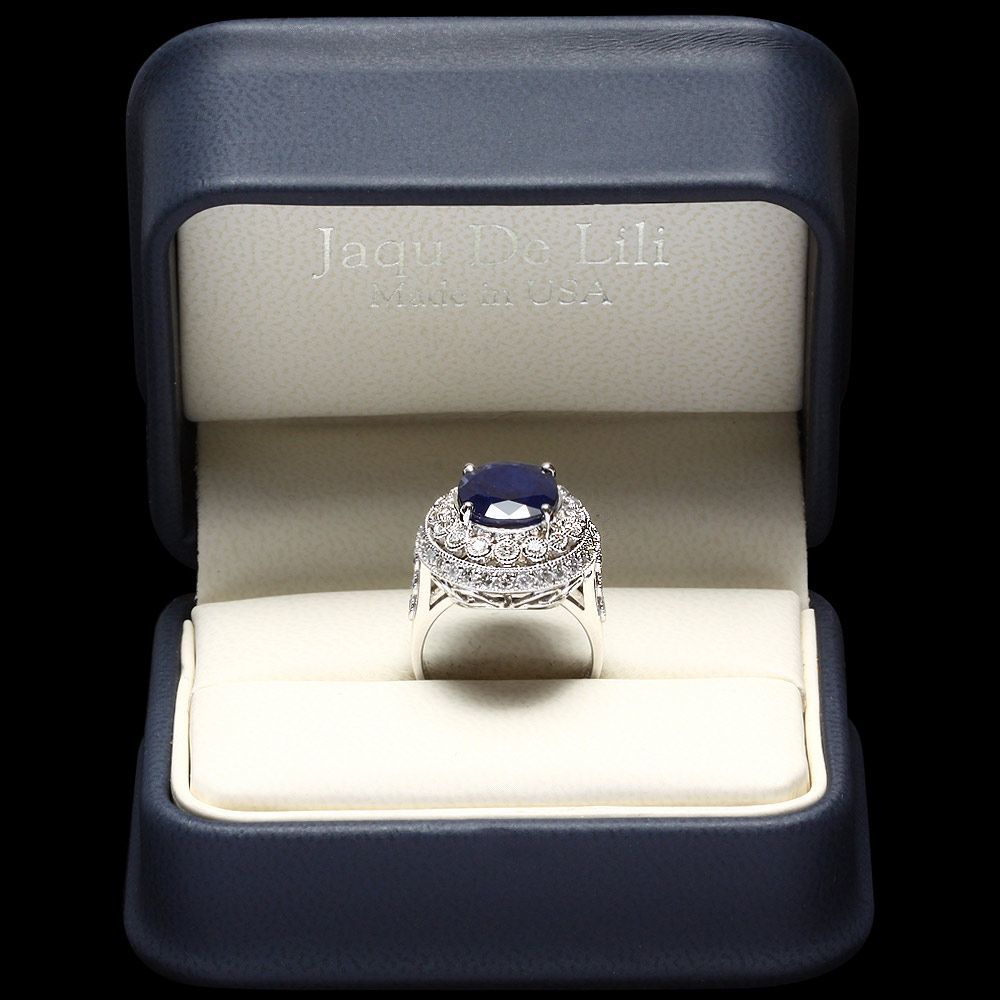 This magnificent ladies ring is crafted in solid 14k White Gold and features a 6.00 carat Natural Sapphire mined from Sri Lanka + accented with 52 sparkling eye-clean natural Diamonds, totaling 1.30 carats. Excellent craftsmanship. Made in USA.