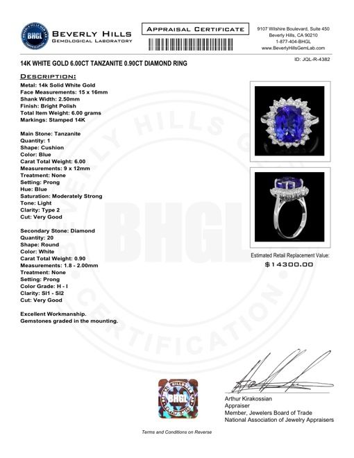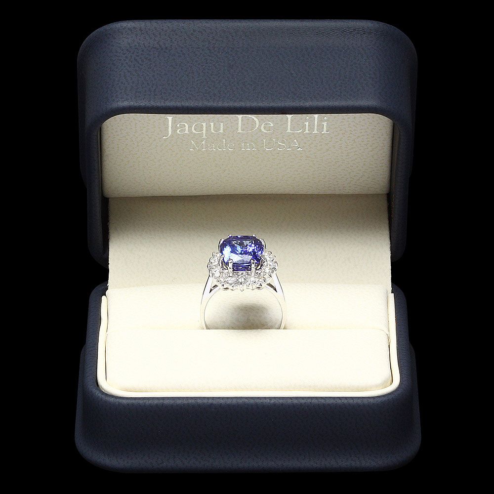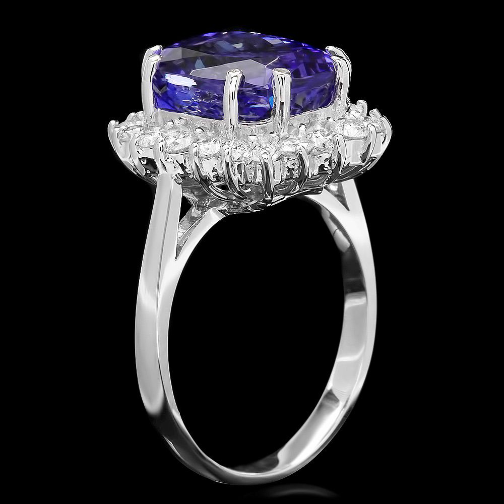 Retail: $14300.00 ****** Metal: 14k Solid White Gold / Size: 7.25 / Total Item Weight: 6.00 grams / Country Made: USA / / Main Stone: Tanzanite / Color: Blue / Carat Total Weight: 6.00 / Treatment: None / Clarity: Type 2 / Cut: Very Good / / Secondary Stone: Diamond / Carat Total Weight: 0.90 / Treatment: None / Color Grade: H - I / Clarity: SI1 - SI2 / Cut: Very Good / ****** Ref: JQL-R-4382