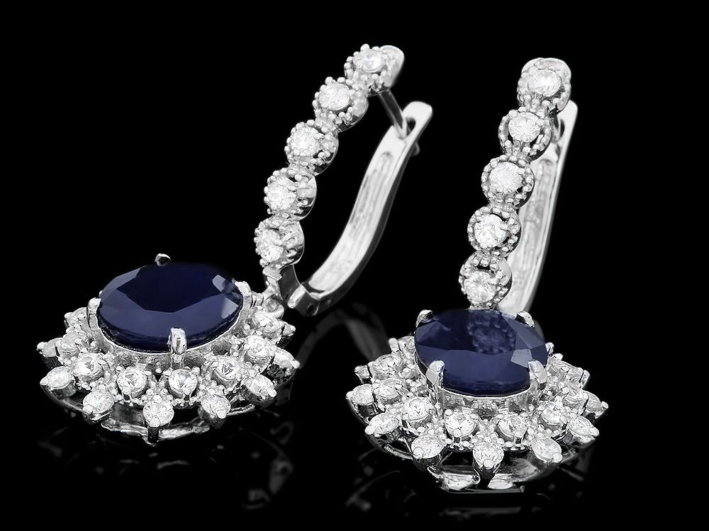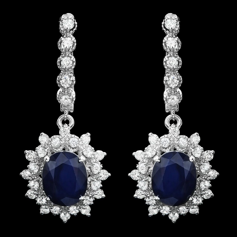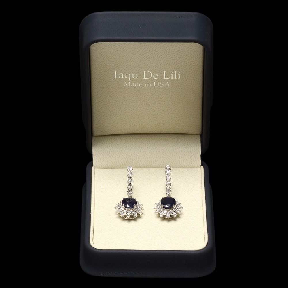 Retail: $6600.00 ****** Metal: 14k Solid White Gold / Total Item Weight: 8.0 grams / Country Made: USA / / Main Stone: Sapphire / Color: Blue / Carat Total Weight: 6.0 / Treatment: Heating / Clarity: Type 2 / Cut: Very Good / / Secondary Stone: Diamond / Carat Total Weight: 1.60 / Treatment: None / Color Grade: G - H / Clarity: SI1 - SI2 / Cut: Very Good / ****** Ref: JQL-ER-5225