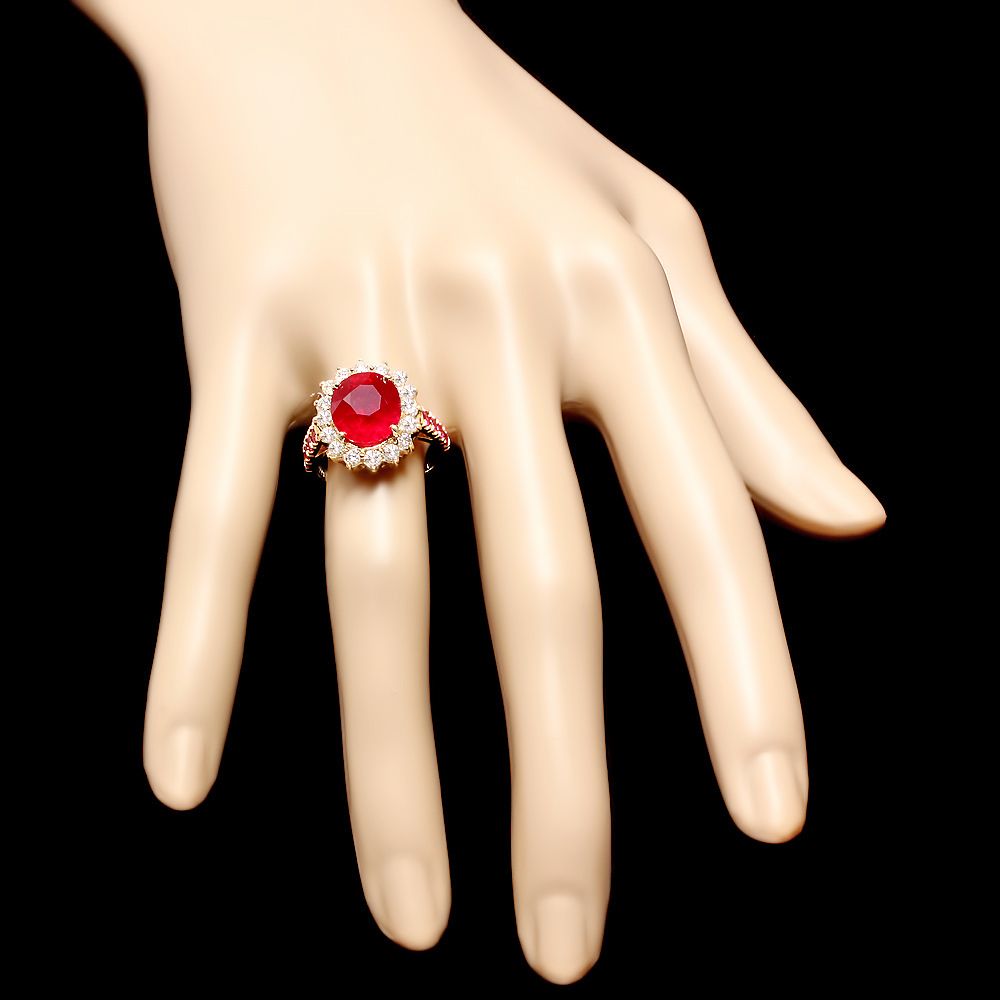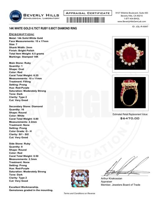 Retail: $6470.00 ****** Metal: 14k Solid White Gold / Size: 7 / Total Item Weight: 6.5 grams / Country Made: USA / / Main Stone: Ruby / Color: Red / Carat Total Weight: 6.25 / Treatment: Filling / Clarity: Type 2 / Cut: Very Good / / Secondary Stone: Diamond / Carat Total Weight: 0.80 / Treatment: None / Color Grade: G - H / Clarity: SI1 - SI2 / Cut: Very Good / / Side Stone: Ruby / Color: Red / Carat Total Weight: 0.50 / Treatment: None / Clarity: Type 2 / Cut: Very Good / ****** Ref: JQL-R-6847