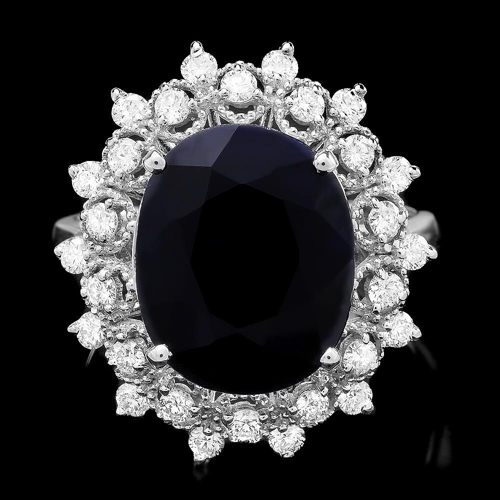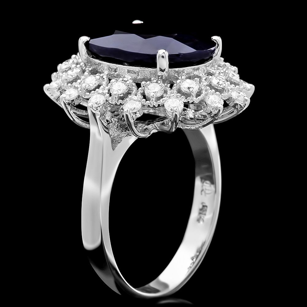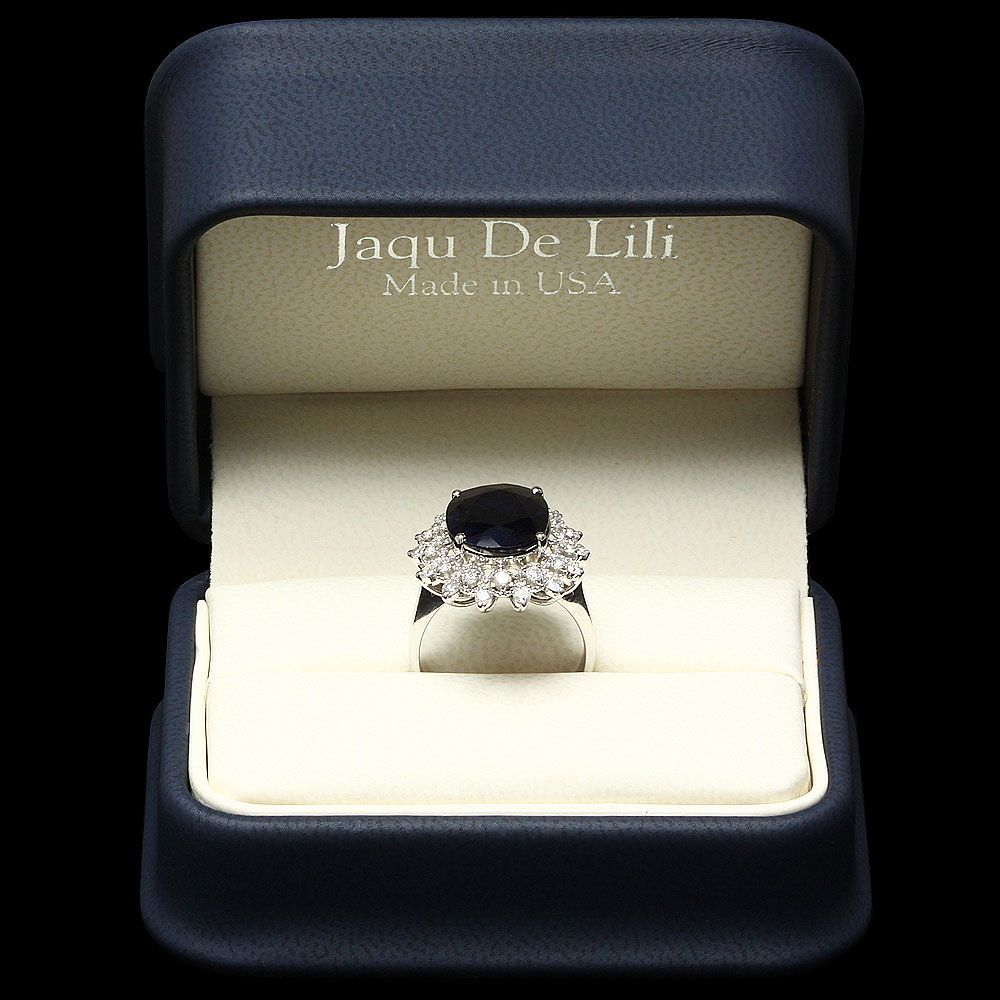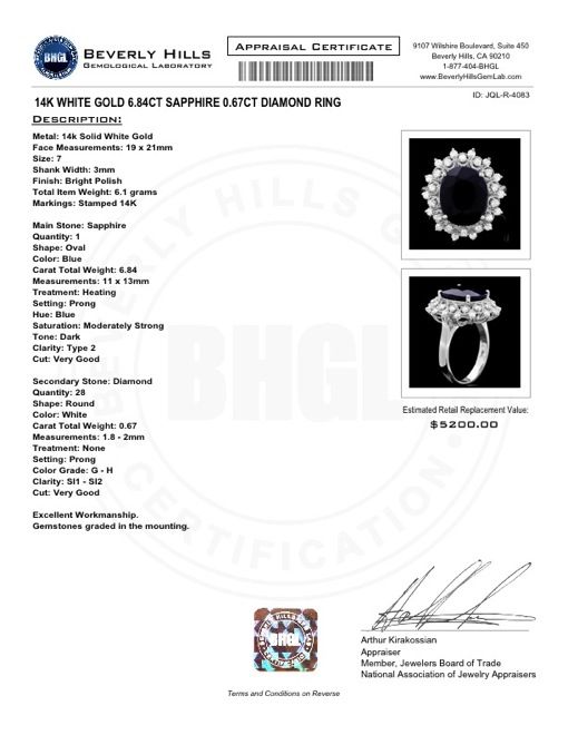 Retail: $5200.00 ****** Metal: 14k Solid White Gold / Size: 7 / Total Item Weight: 6.1 grams / Country Made: USA / / Main Stone: Sapphire / Color: Blue / Carat Total Weight: 6.84 / Treatment: Heating / Clarity: Type 2 / Cut: Very Good / / Secondary Stone: Diamond / Carat Total Weight: 0.67 / Treatment: None / Color Grade: G - H / Clarity: SI1 - SI2 / Cut: Very Good / ****** Ref: JQL-R-4083