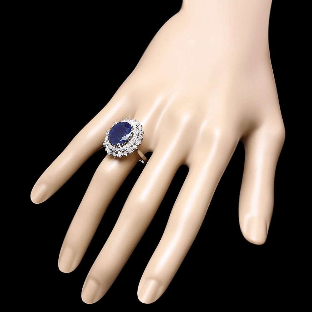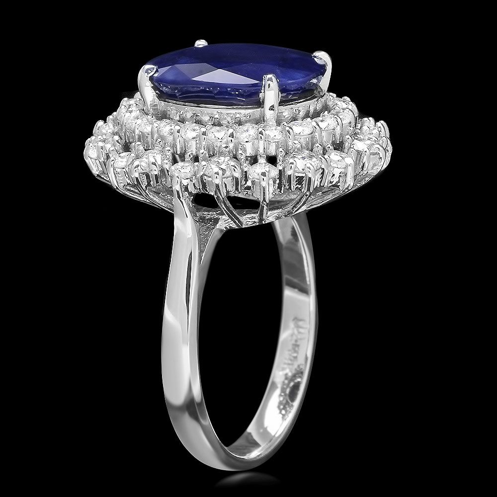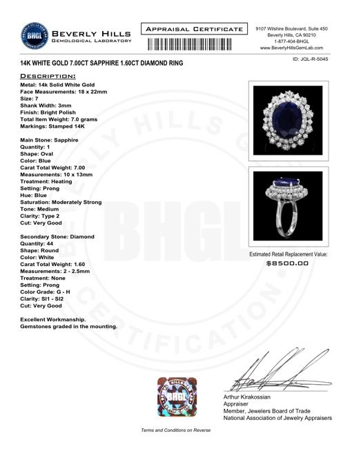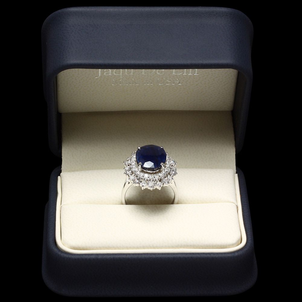Retail: $8500.00 ****** Metal: 14k Solid White Gold / Size: 7 / Total Item Weight: 7.0 grams / Country Made: USA / / Main Stone: Sapphire / Color: Blue / Carat Total Weight: 7.00 / Treatment: Heating / Clarity: Type 2 / Cut: Very Good / / Secondary Stone: Diamond / Carat Total Weight: 1.60 / Treatment: None / Color Grade: G - H / Clarity: SI1 - SI2 / Cut: Very Good / ****** Ref: JQL-R-5045
