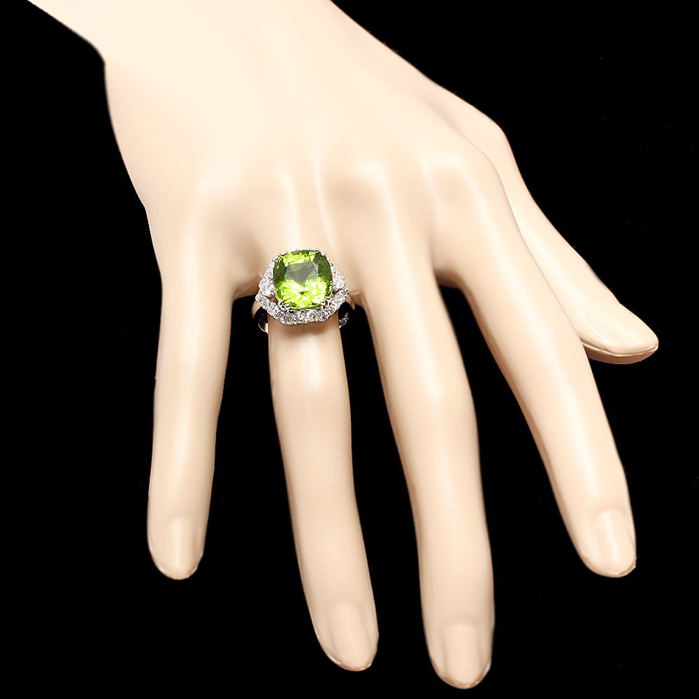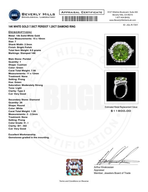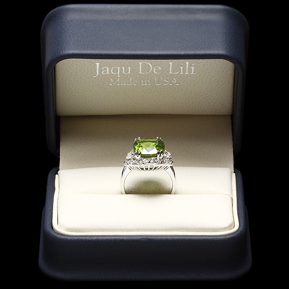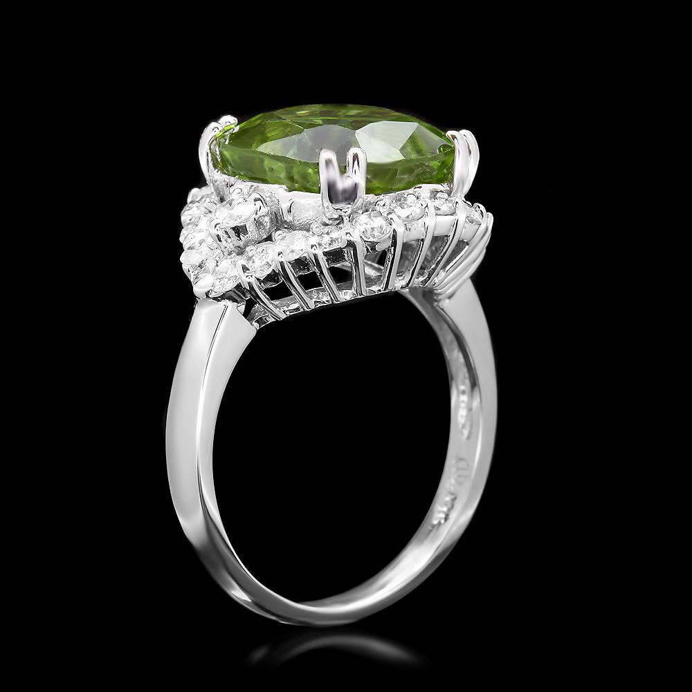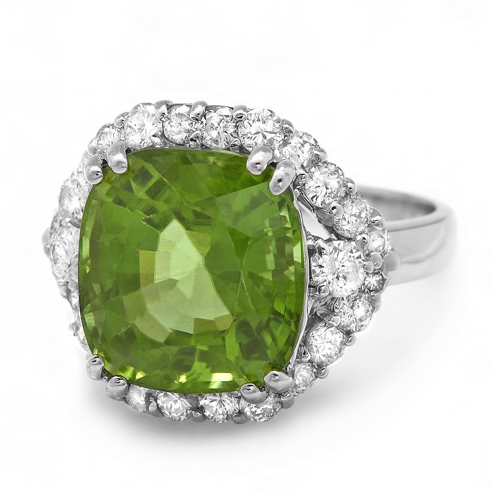 Retail: $11800.00 ****** Metal: 14k Solid White Gold / Size: 7 / Total Item Weight: 6.0 grams / Country Made: USA / / Main Stone: Peridot / Color: Green / Carat Total Weight: 7.50 / Treatment: None / Clarity: Type 2 / Cut: Very Good / / Secondary Stone: Diamond / Carat Total Weight: 1.20 / Treatment: None / Color Grade: H - I / Clarity: SI1 - SI2 / Cut: Very Good / ****** Ref: JQL-R-7201