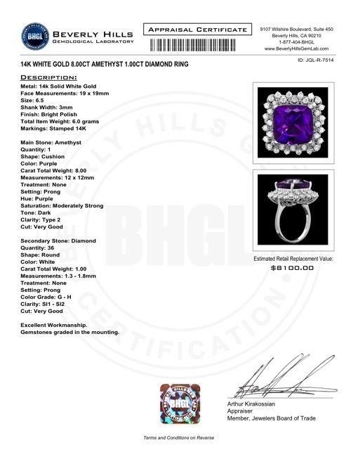 Regarding Appraised Jewelry and Loose Stones - WESTBURY AUCTION GALLERIES sends them out to a third party for Retail Replacement Value Appraisals, which are the most common. These types of evaluations are written for insurance needs. This would be the cost to replace the jewelry with an item of equal quality and kind, considered to be the current market price or the replacement value. This type of appraisal is done to protect you in the event of damage or loss of a valuable item. Our appraisals are conducted by independent 3rd Party appraisal firms that utilizes Certified GIA Gemologist. Appraisals should be used for verification of gemstone and/or metal weight, size, and grade only, not actual value. Appraisal value should be considered for insurance purposes only, not actual value, as price varies greatly from retail locations thru out the world. Items should not be purchased with the expectation to resell for appraisal price, or for profit.