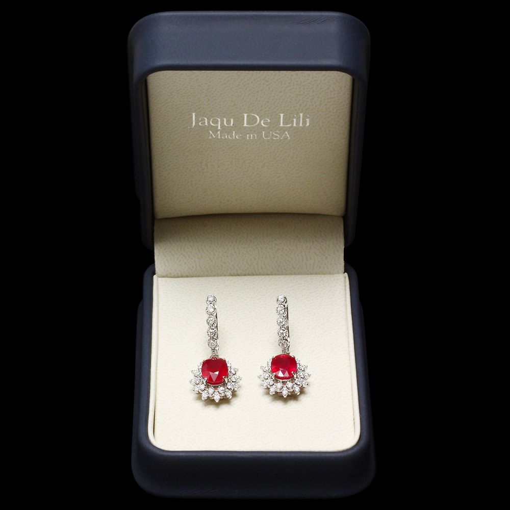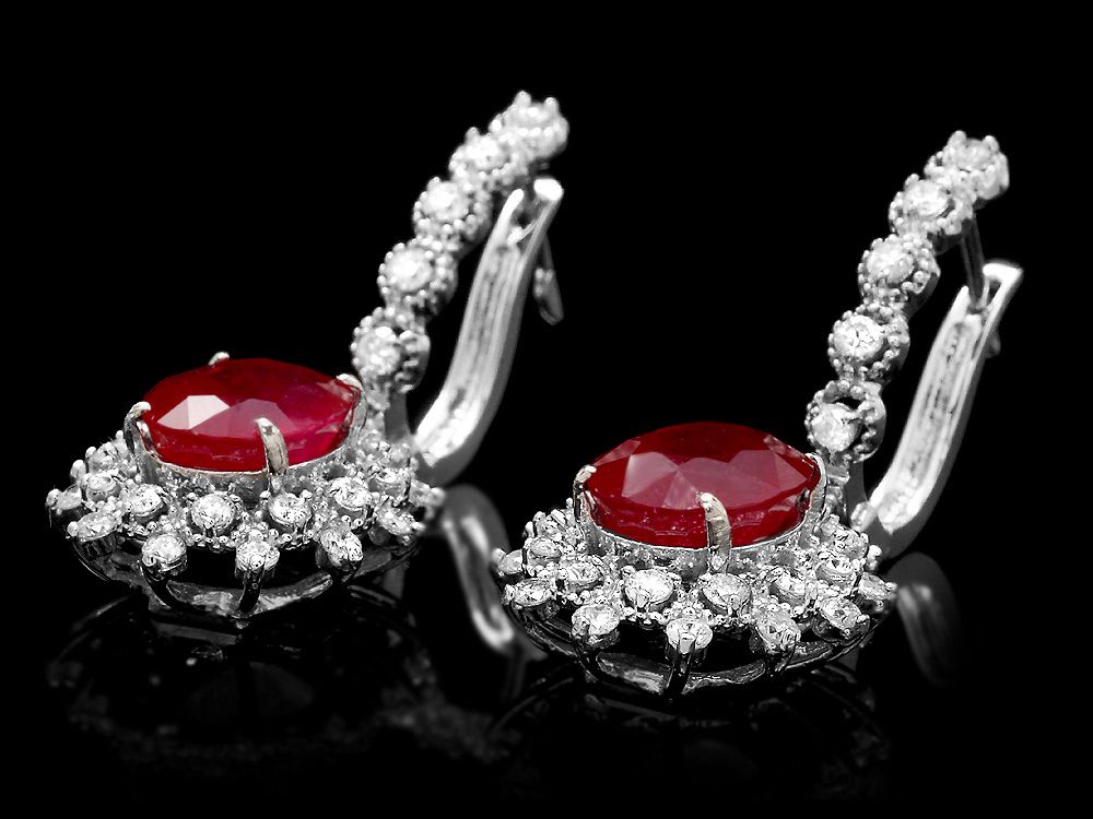 Retail: $12600.00 ****** Metal: 14k Solid White Gold / Total Item Weight: 8.5 grams / Country Made: USA / / Main Stone: Ruby / Color: Red / Carat Total Weight: 8.00 / Treatment: Filling / Clarity: Type 2 / Cut: Very Good / / Secondary Stone: Diamond / Carat Total Weight: 1.40 / Treatment: None / Color Grade: G - H / Clarity: SI1 - SI2 / Cut: Very Good / ****** Ref: JQL-ER-5962