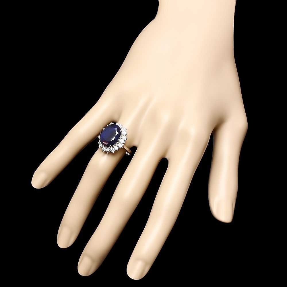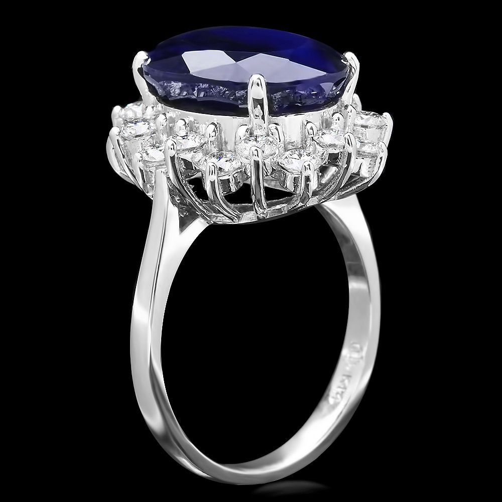 This elegant ladies ring is crafted in solid 14k White Gold and features a 9.50 carat Natural Sapphire mined from Sri Lanka + accented with 18 sparkling eye-clean natural diamonds, totaling 1.20 carats. Excellent craftsmanship. Made in USA.