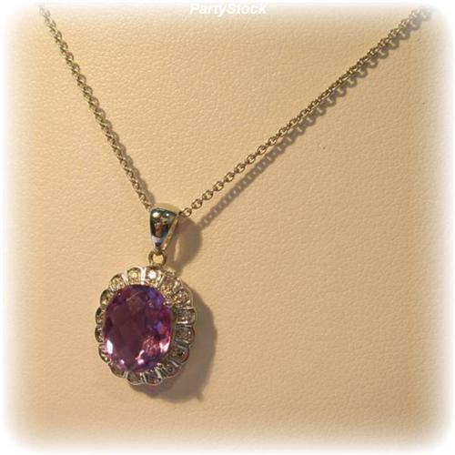 Solid 14 Karat White Gold sets this exquisite, large, genuine 3 Carat, Amethyst and Diamond Pendant. It is strung on a feminine, solid 14 Karat White Gold Foxtail Chain of 16 inches length. A perfectly exquisite necklace.