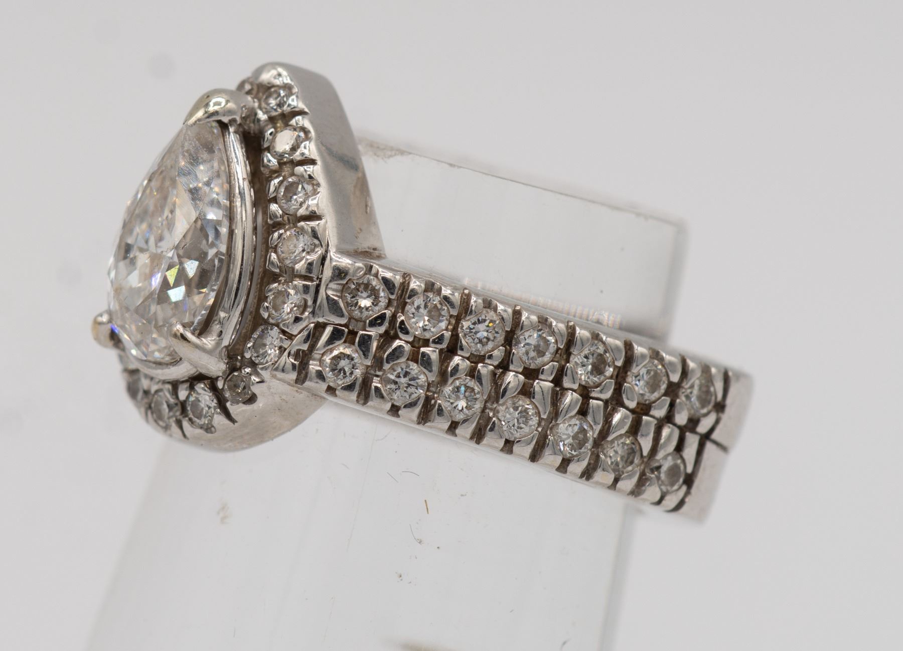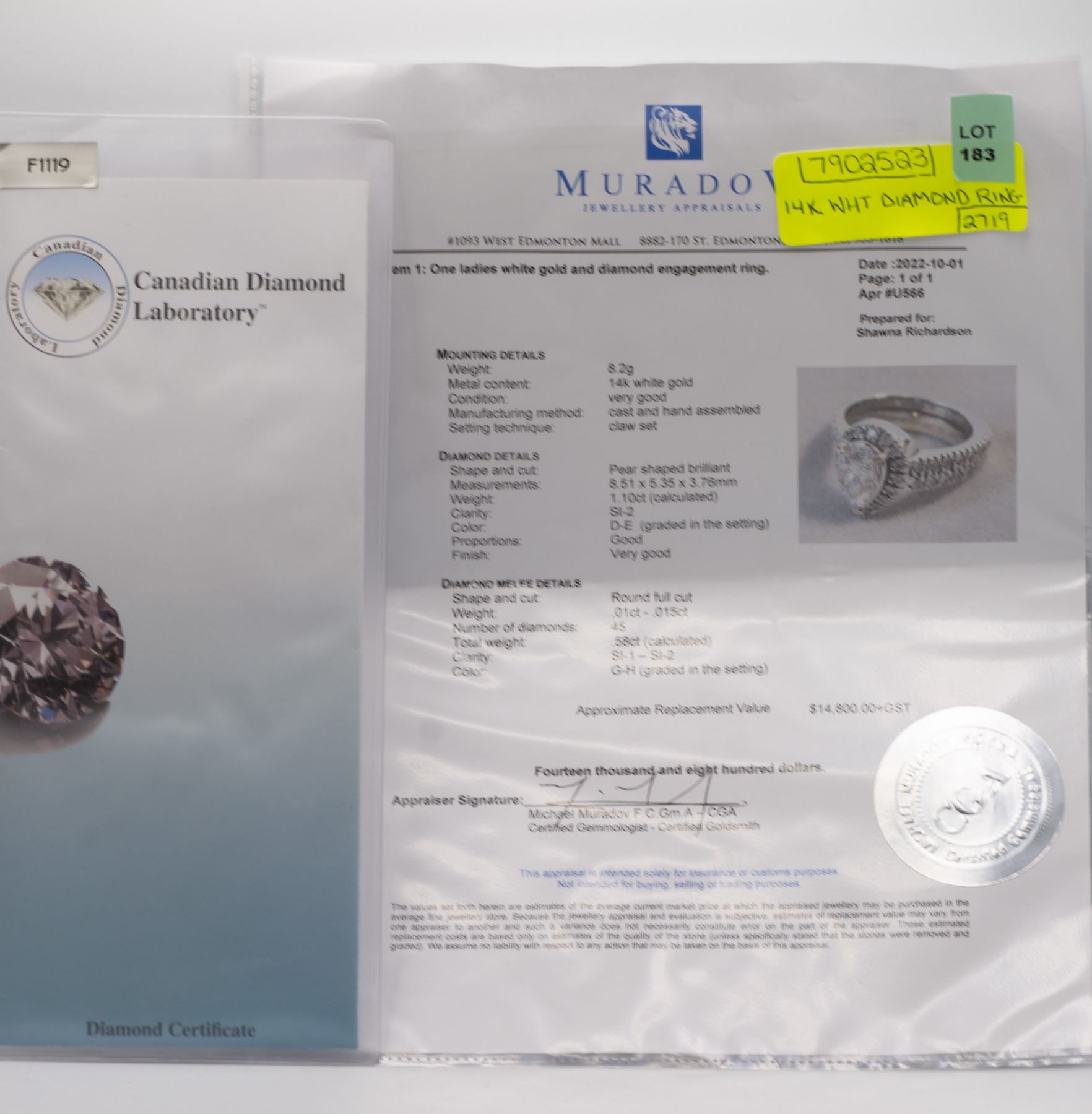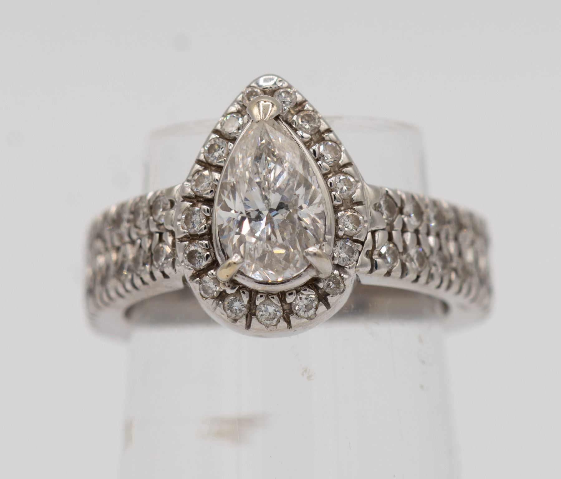 8.2G OF WEIGHT, 14K WHITE GOLD APPRAISED CONDITION IS VERY GOOD. CLAW SET PEAR SHAPED BRILLIANT DIAMOND MEASURING 8.51 X 5.35 X 3.76mm. DIAMOND WEIGHT 1.10CT, CLARITY IS SI-2, COLOR D-E, PROPORTIONS ARE GOOD AND FINISH IS VERY GOOD. DIAMOND MELEE IS MADE OF 45 ROUND FULL CUT WEIGHING BETWEEN .01-.015CT. TOTAL WEIGHT OF MELEE .58CT. CLARITY OF MELEE IS SI-1 -- SI-2, COLOR IS G-H. COMES WITH RECENT APPRAISAL, VALUED AT $14,800.00 **ALL ITEMS MUST BE REMOVED BY 5PM MONDAY, OCTOBER 31, 2022. ALL REMAINING ITEMS WILL BE SUBJECT TO A $6.00 PER DAY STORAGE CHARGE. ANY ITEMS REMAINING AFTER MONDAY, NOVEMBER 21, 2022 WILL BE CONSIDERED FORFEITED. NO REFUNDS WILL BE ISSUED FOR FORFEITED ITEMS. TO SCHEDULE A PICK UP APPOINTMENT CLICK HERE