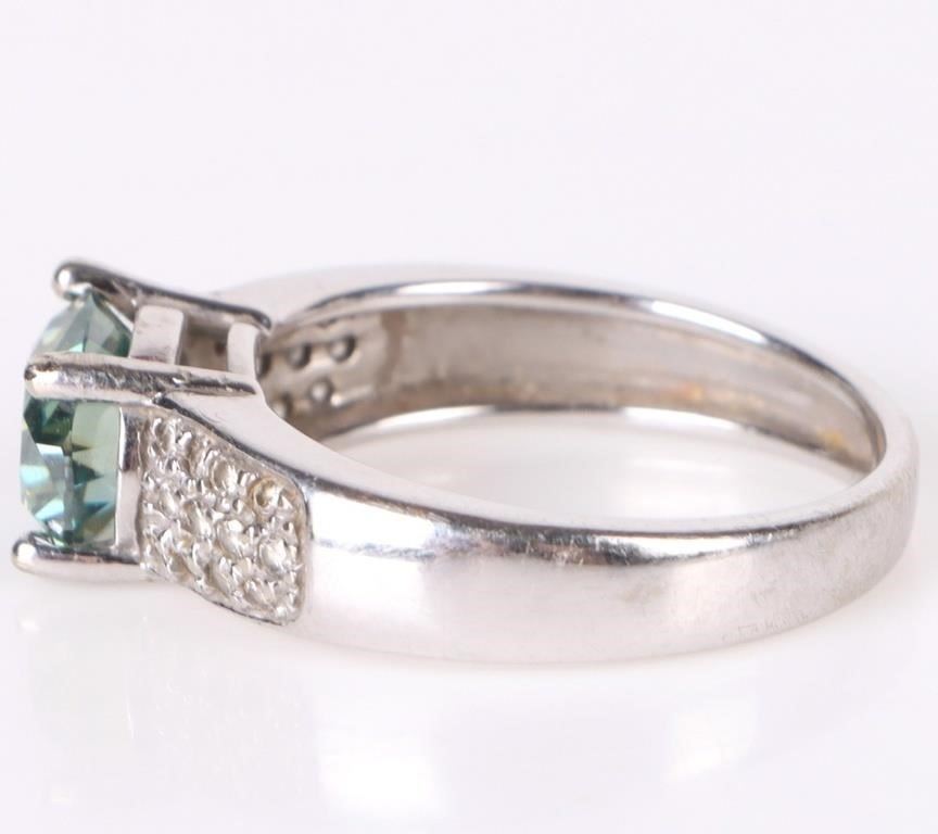 14K white gold blue moissanite diamond ladies ring. Gemstones to include one 1.50ct oval cut blue moissanite, and twenty-four 0.005ct round cut diamonds.
