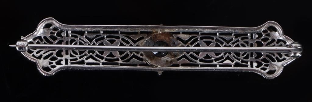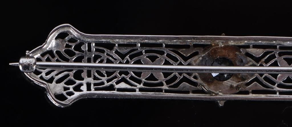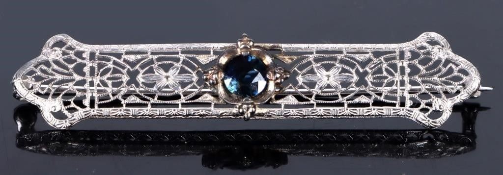 14K white gold blue sapphire filigree brooch. Gemstones to include one 0.55ct round faceted blue sapphire.