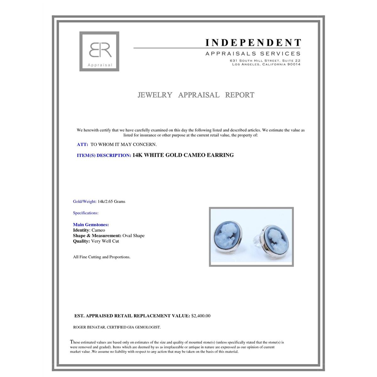 Not all jewelry, watches or loose stones are appraised and the appraisals are provided for bidders only in certain instances at the discretion of the Company. Appraisals, if any should be use to verify gemstone and or metal weights. The appraisals should not be used for valuation of any item. No guarantee, warranty or representation is intended by the Company in any appraisal. All dimensions and weights of such lots are approximate and are consistent with standards and practices in the industry. Condition reports are provided as a service to the prospective buyer. Bidders should take note that such descriptions are not warranties and that watches may need general service, change of battery or further repairs for which the buyer is solely responsible