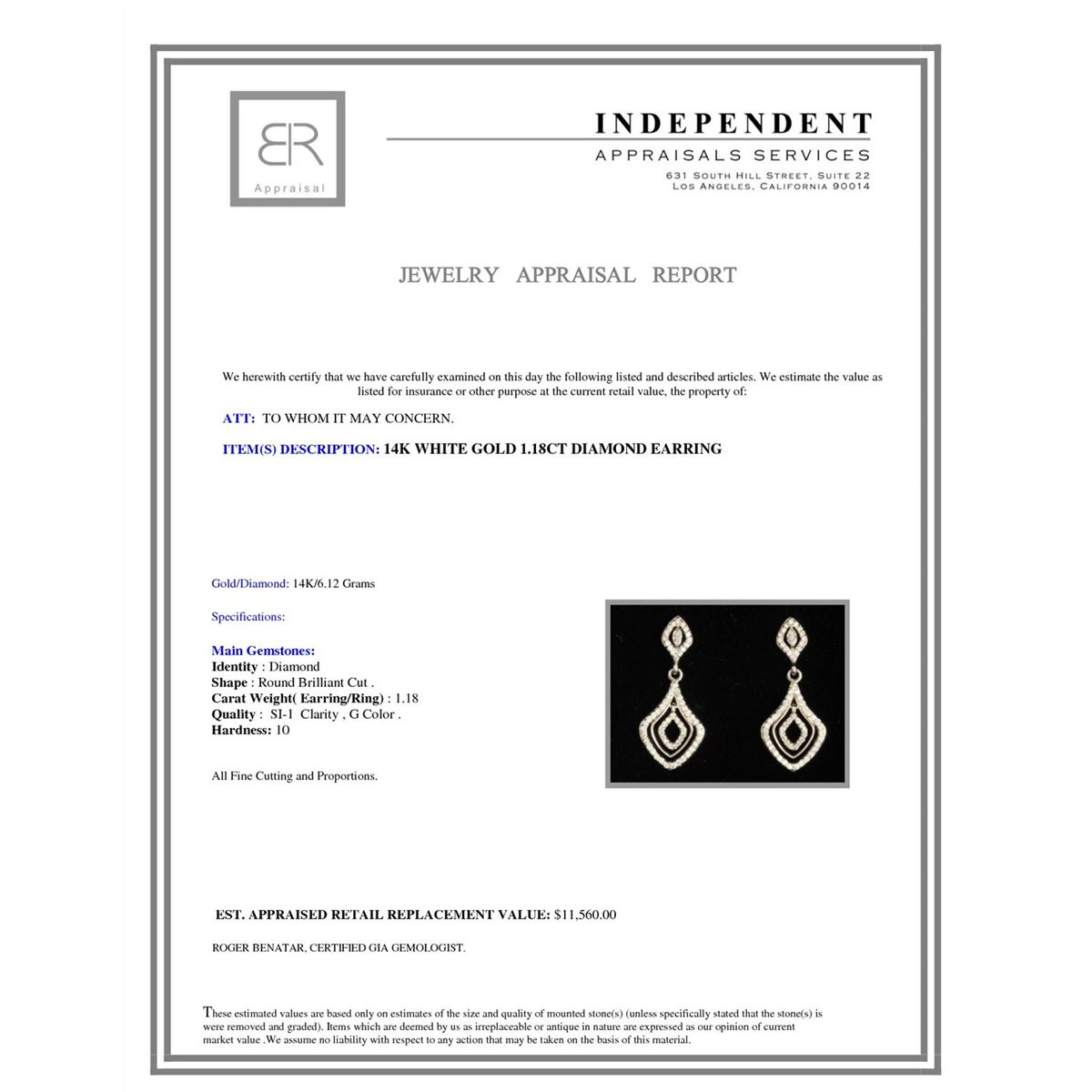 14K WHITE GOLD DIAMOND EARRING:6.12 GRAMS/DIAMOND:1.18CT/#R8063