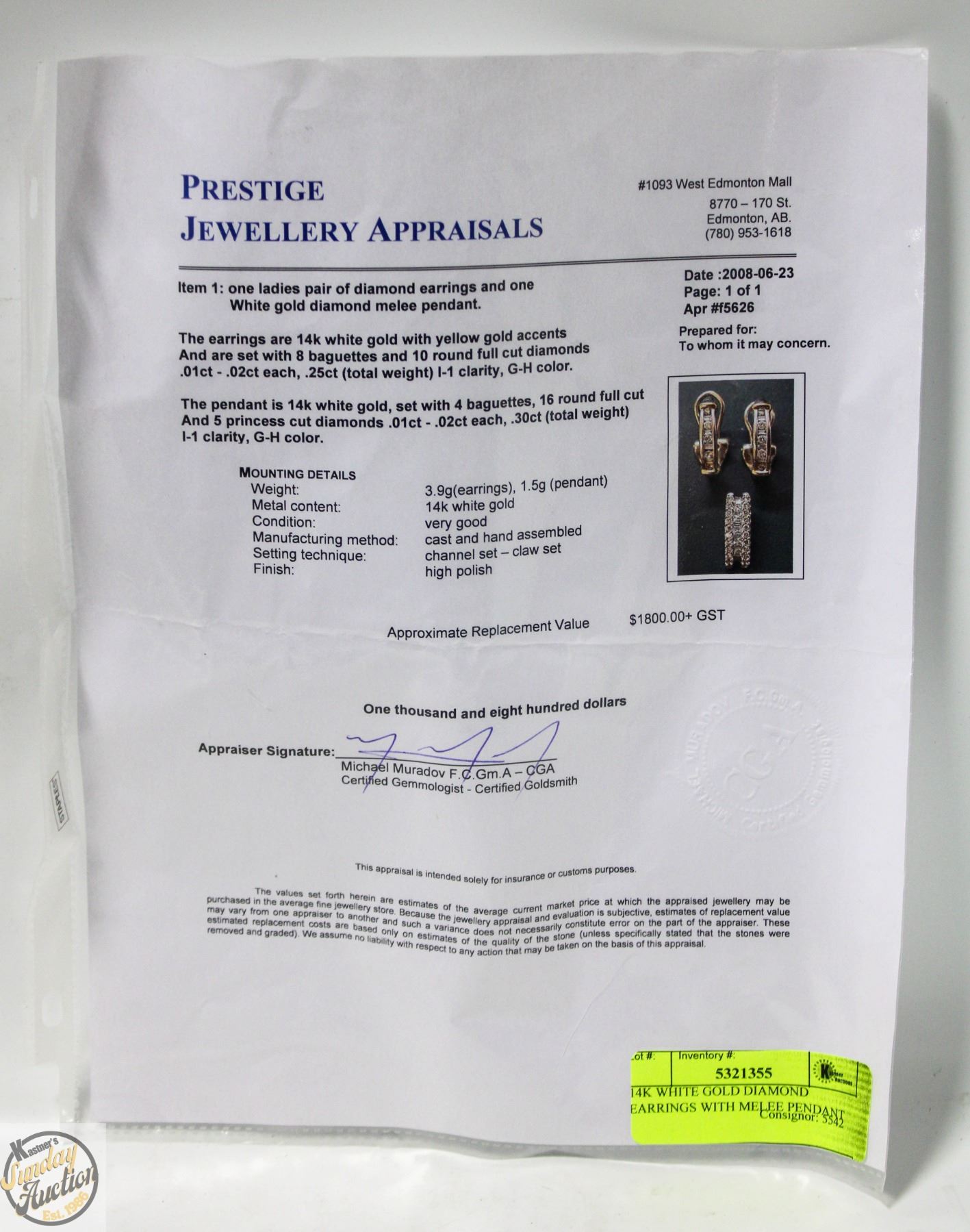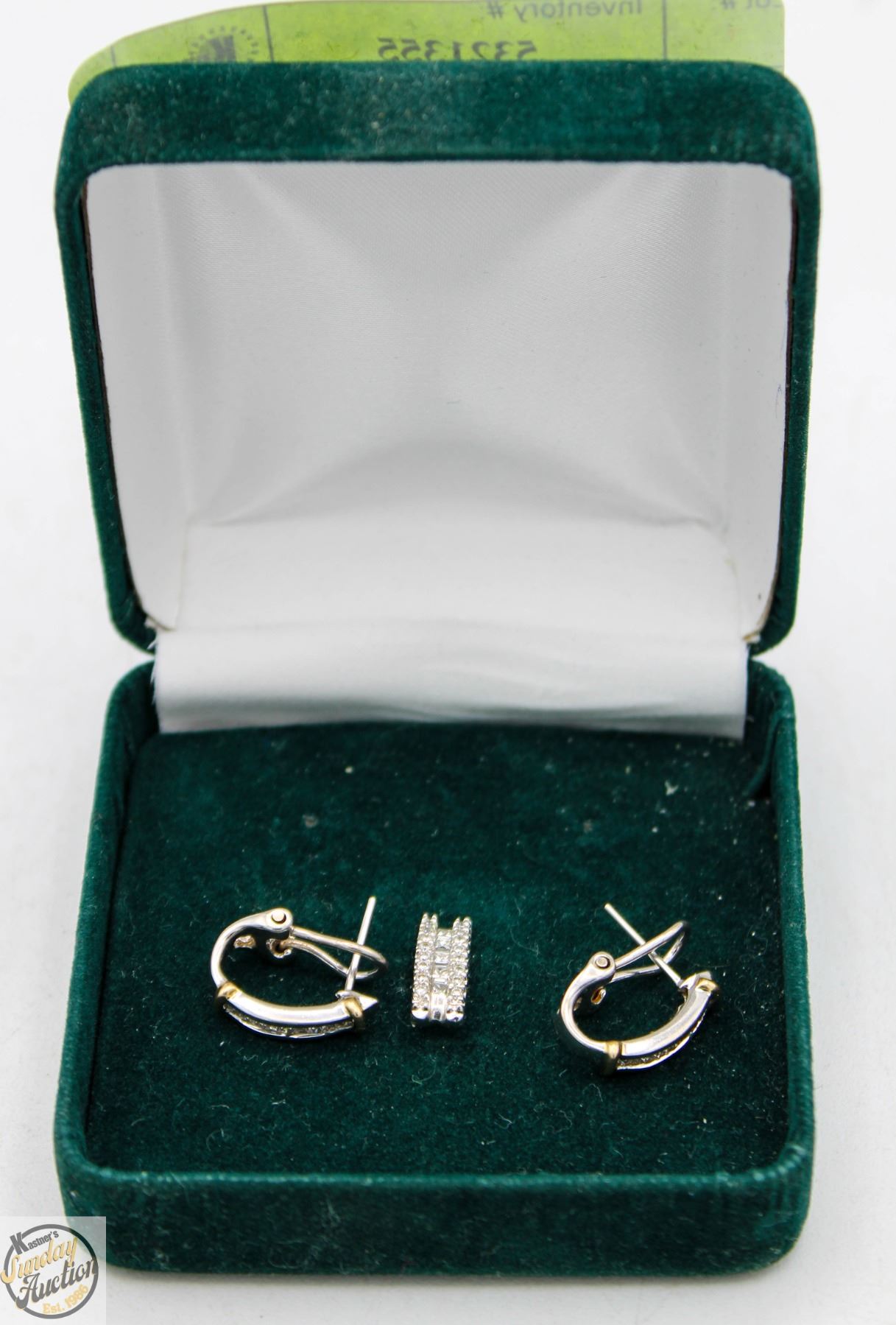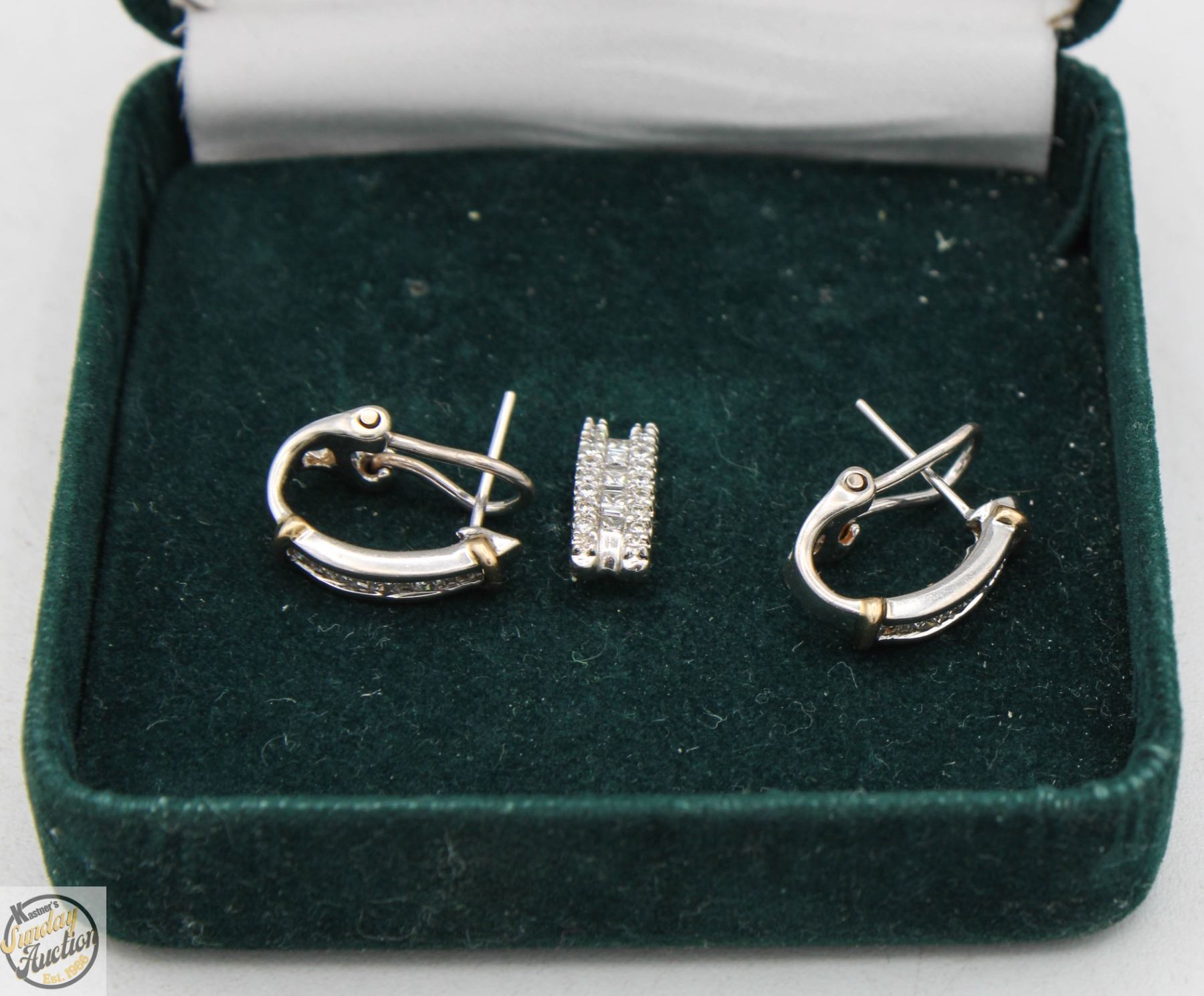 EARRINGS ARE 14K WHITE GOLD WITH YELLOW ACCENTS, SET WITH 8 BAGUETTES AND 10 ROUND FULL CUT DIAMONDS, 0.1-0.2CT EACH, .25CT TOTAL WEIGHT, AVERAGE OF I-1 CLAIRTY AND G-H COLOR.