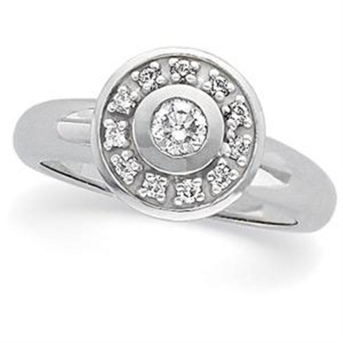 Beautiful 14k White Gold Diamond Engagement ring featuring a center Round Diamond encircled by smaller round SPARKLING Diamonds! The Diamonds are beautiful 'SI' Clarity and Fine 'H' Color, and the Diamond Total Weight= .40 CARATS! Size 6, and I can resize for you.