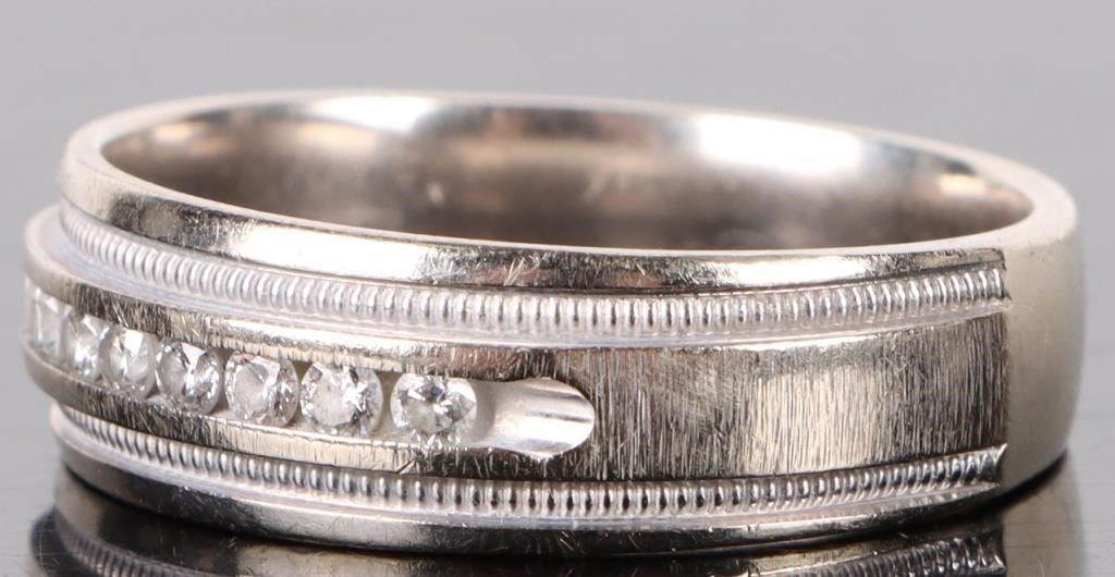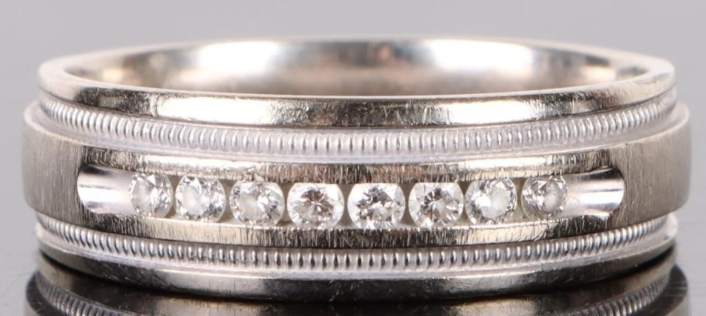 14K white gold diamond etched unisex ring to include: eight 0.02ct round cut diamonds.