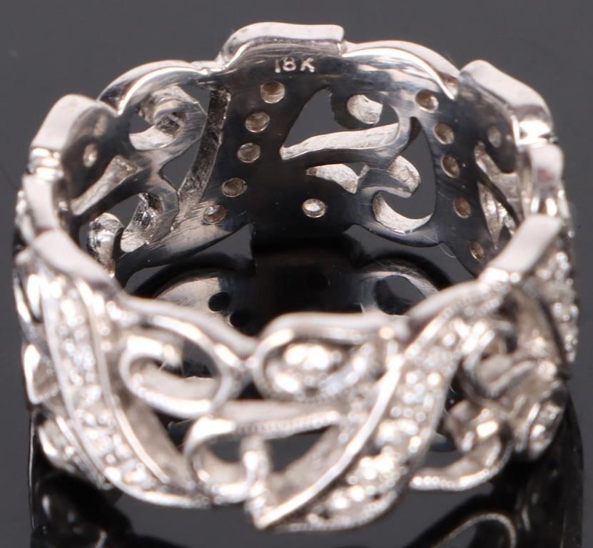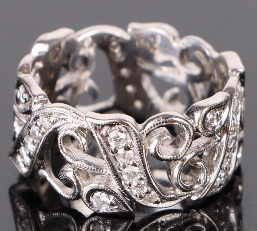 14K white gold diamond filigree ladies ring to include a unique filigree band design. Gemstones to include thirty-six 0.02ct round cut diamonds.