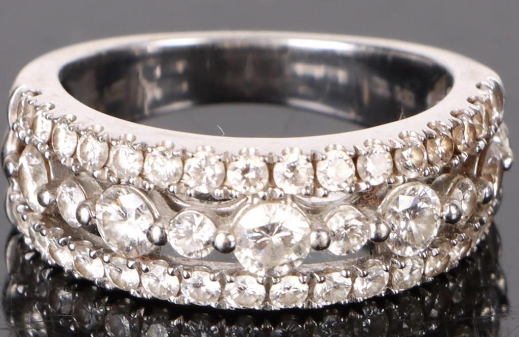 14k white gold diamond ladies ring with one 0.15ct round diamond, four 0.10ct round diamonds, four 0.03ct round diamonds, and thirty-two 0.02ct round diamonds. 1.31 CTW.