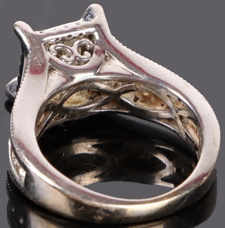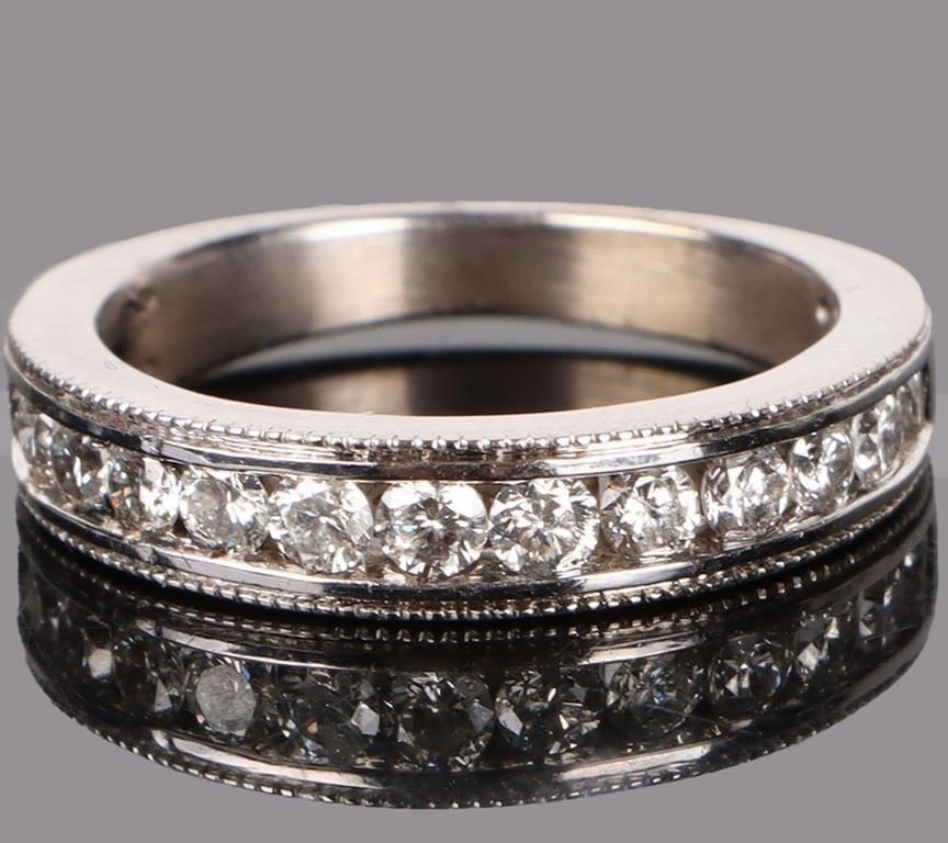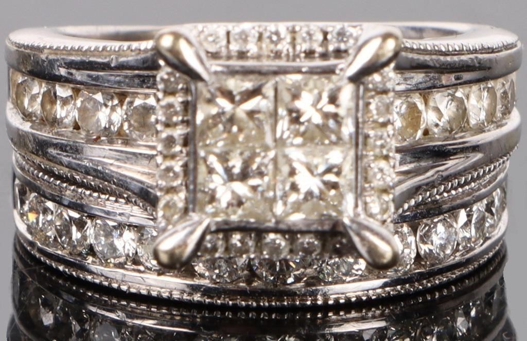 14K white gold diamond ladies wedding ring set to include a DCA inspection. Gemstones on the band ring to include thirteen 0.04ct round cut diamonds. Gemstones on the wedding ring to include four 0.20ct princess cut diamonds, twenty 0.01ct round cut diamonds, and thirteen 0.04ct round cut diamonds.