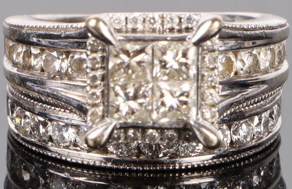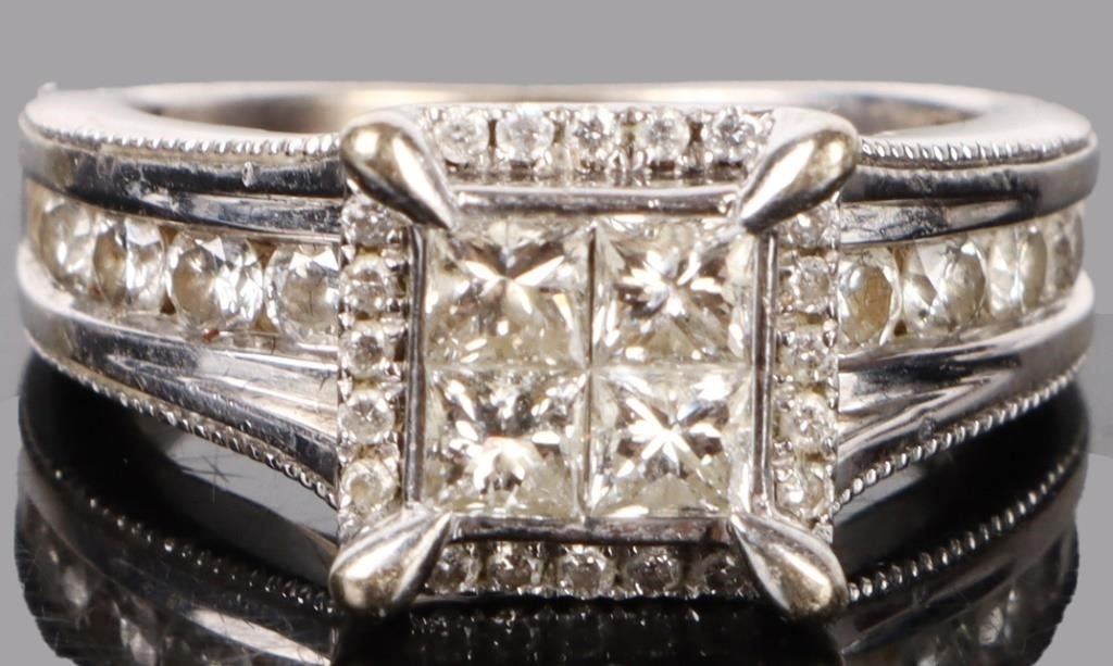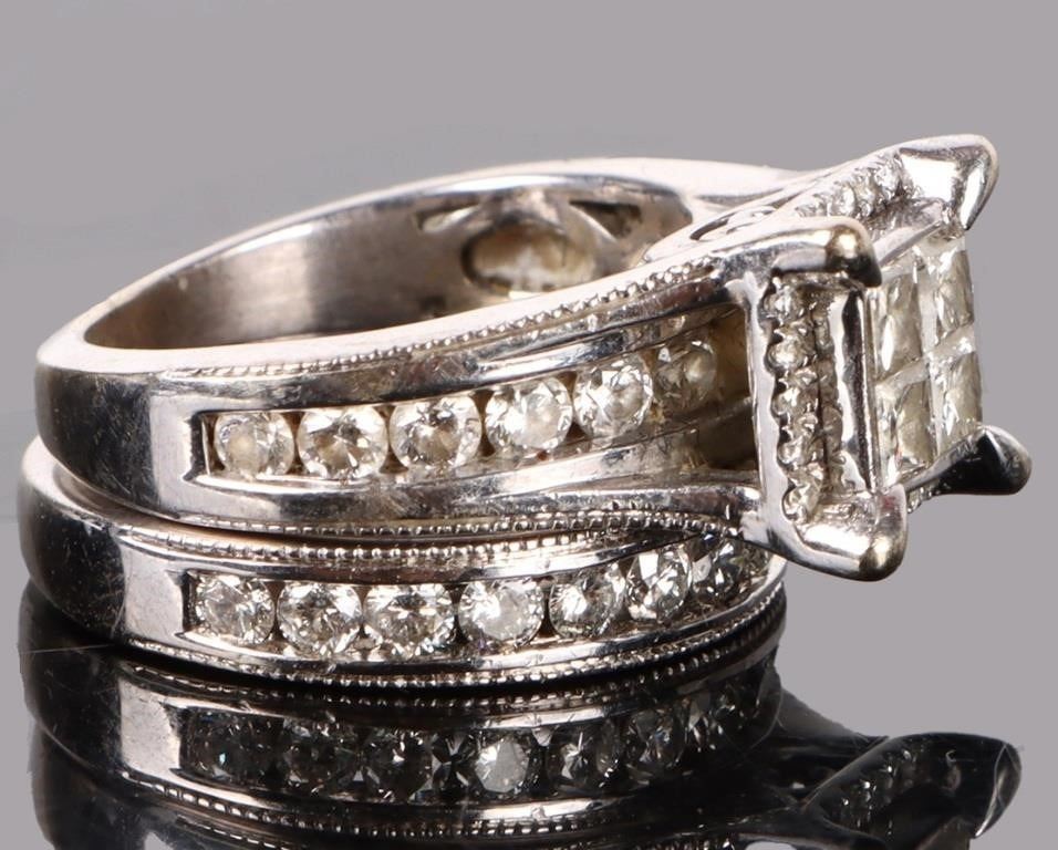 14K white gold diamond ladies wedding set includes a DCA inspection. Gemstones on the band include thirteen 0.04CT round cut diamonds. Gemstones on the wedding ring include four 0.20CT princess cut diamonds, twenty 0.01CT round cut diamonds, and thirteen 0.04CT round cut diamonds.