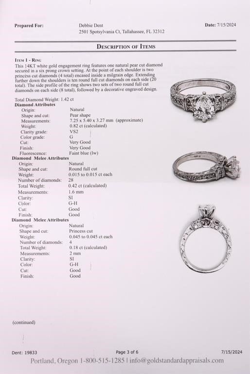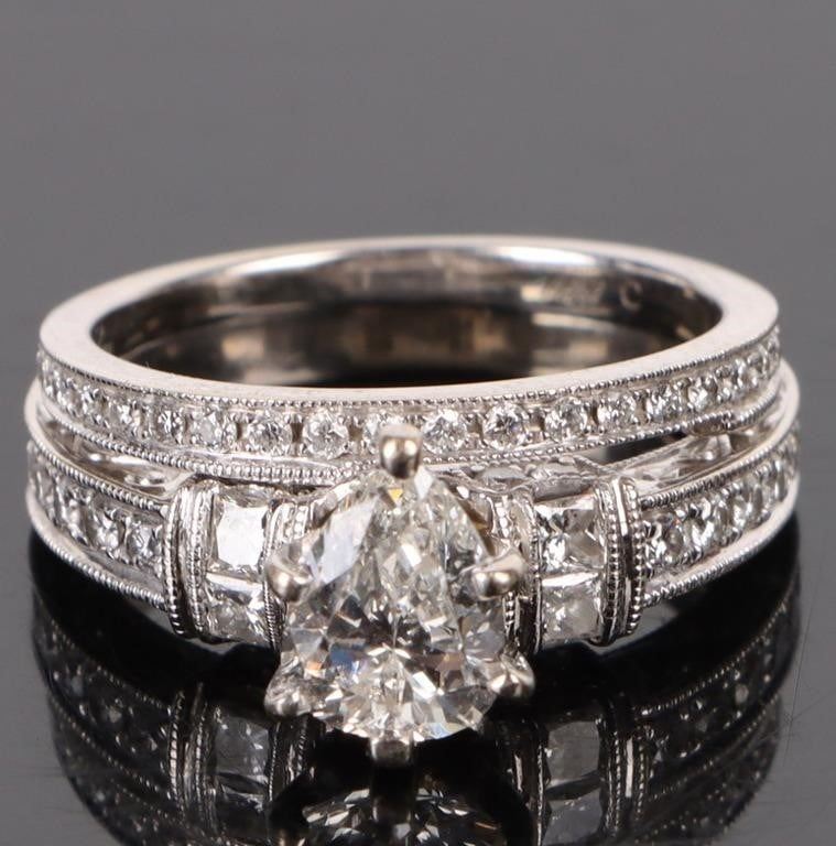 14K white gold diamond Neil Lane band set w/ appraisal for the diamonds in each ring. Gemstones to include one 0.82ct pear cut diamond gemstone VS2, twenty-eight 0.015ct round cut SI diamonds, and four SI 0.045ct princess cut diamonds for one of the rings, the second ring has twenty-nine 0.0065ct round cut SI diamonds.