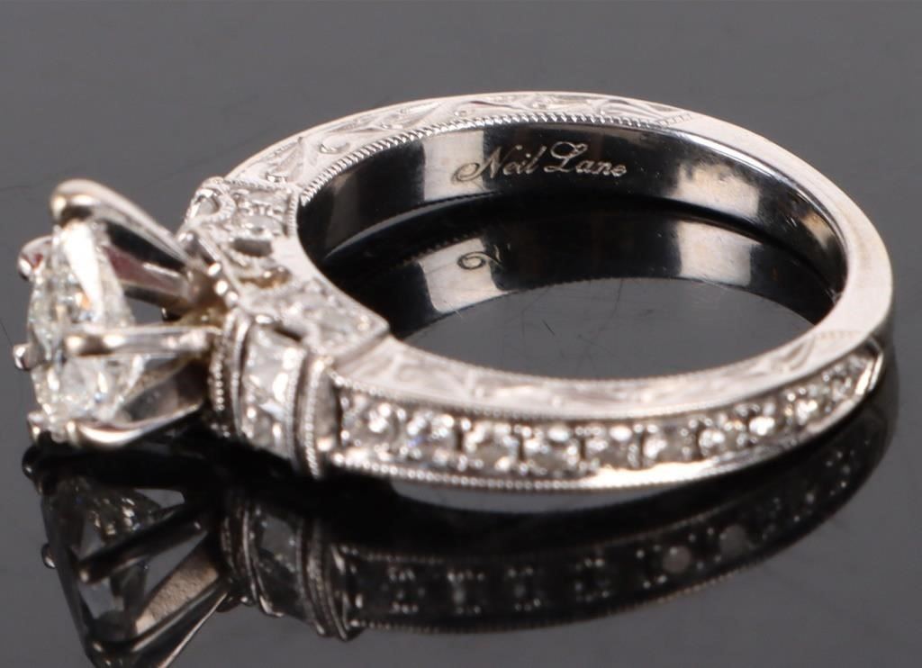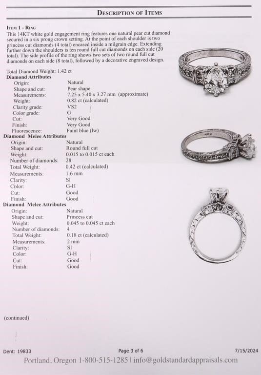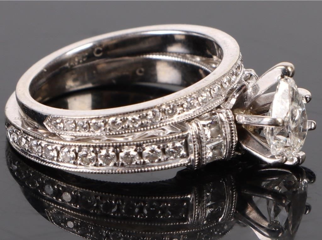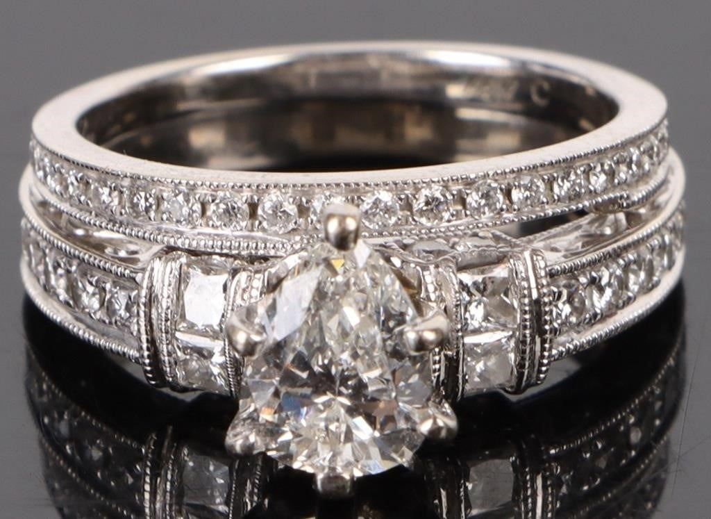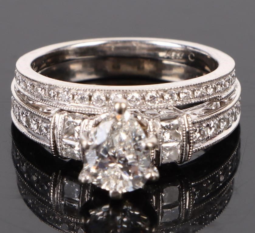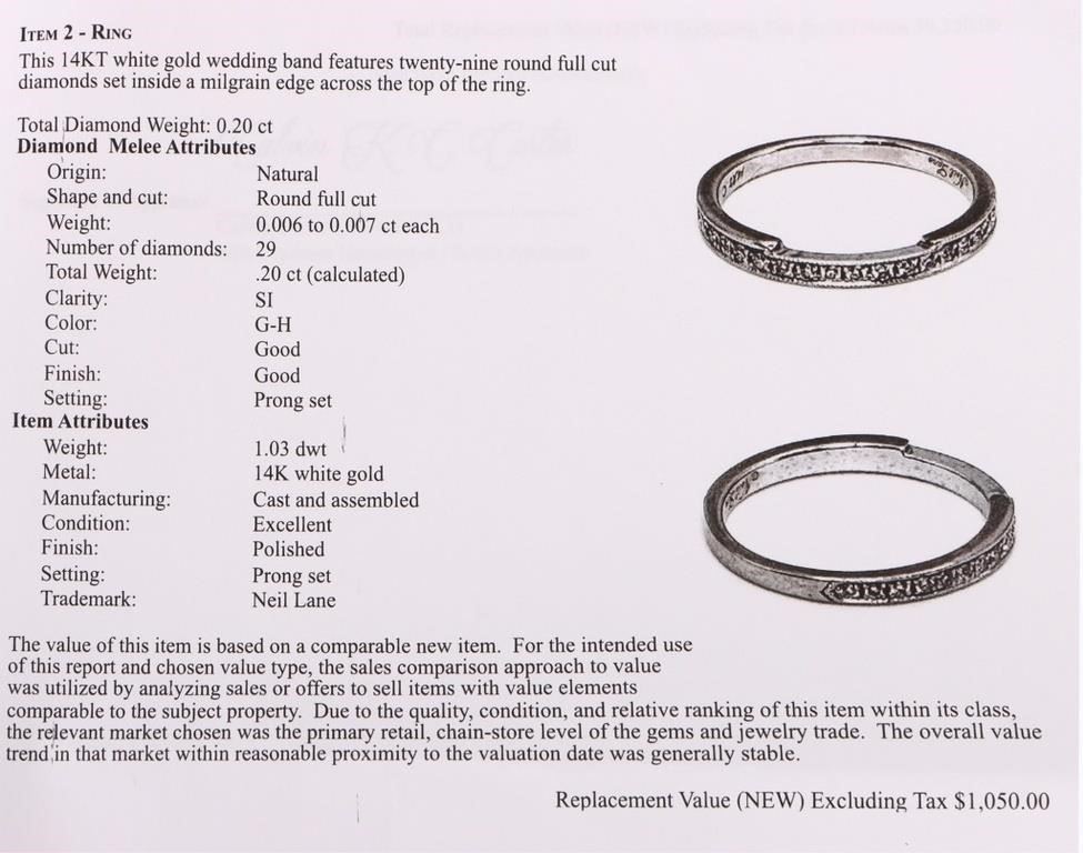 14K white gold diamond Neil Lane band set w/ appraisal for the diamonds in each ring. Gemstones to include one 0.82ct pear cut diamond gemstone VS2, twenty-eight 0.015ct round cut SI diamonds, and four SI 0.045ct princess cut diamonds for one of the rings, the second ring has twenty-nine 0.0065ct round cut SI diamonds.