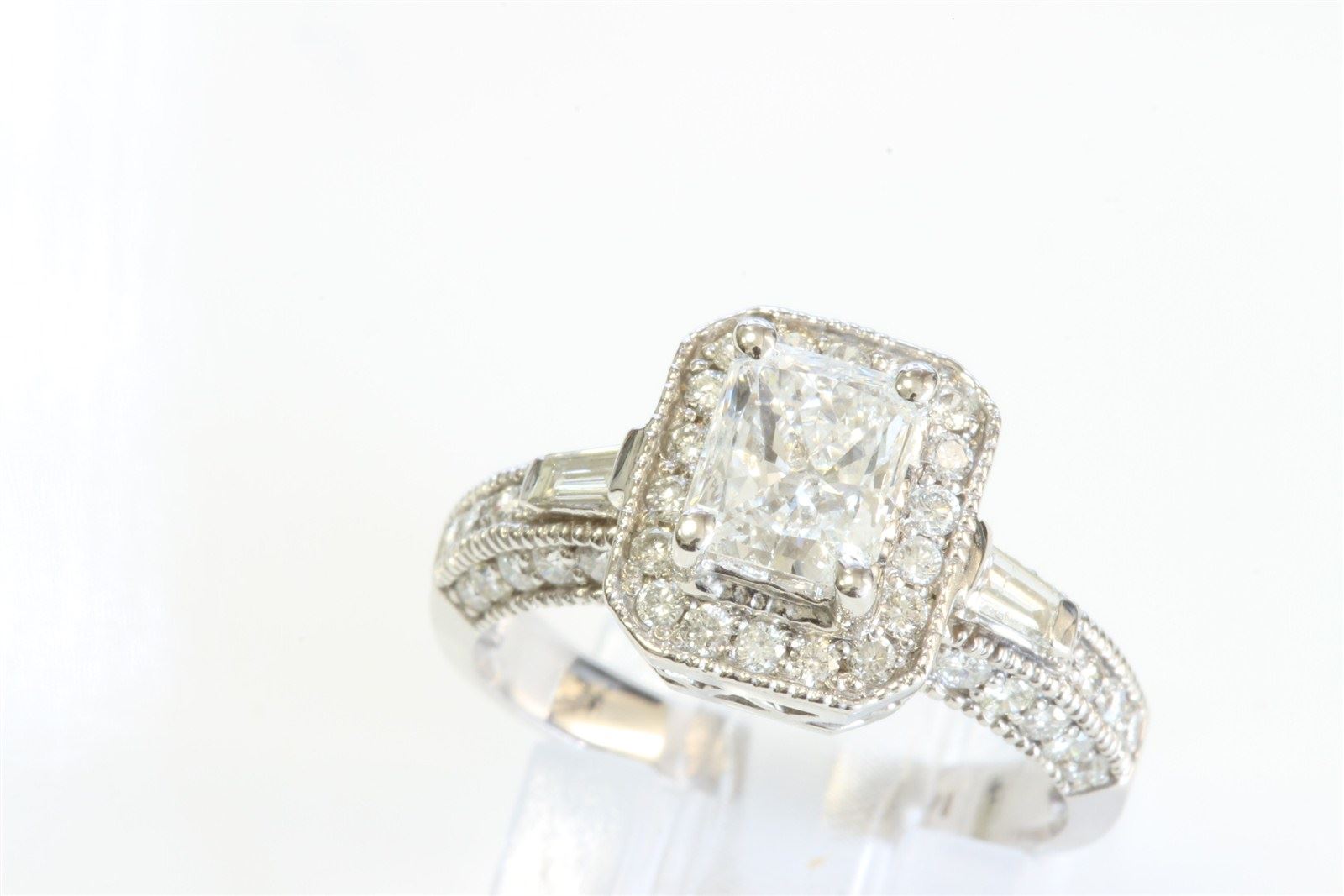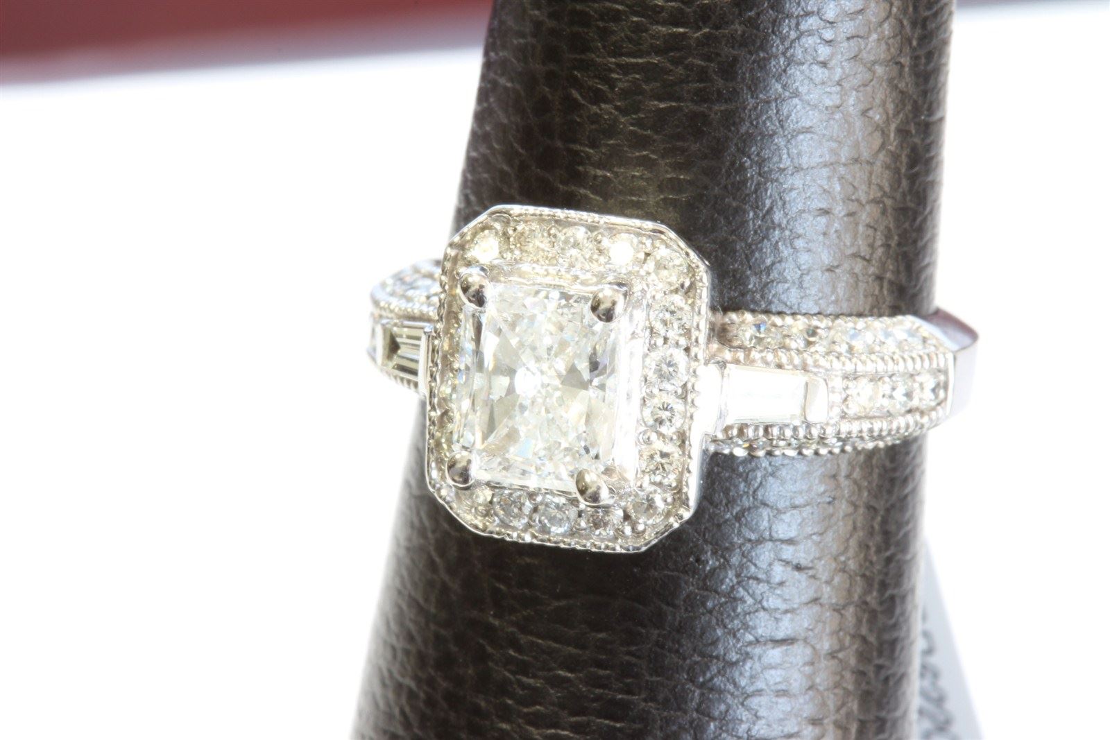 14K WHITE GOLD DIAMOND RING:4.20 GRAMS/DIAMOND SIDES:0.69CT/RADIANT CUT DIAMOND CENTER :1.01CT/#R8047