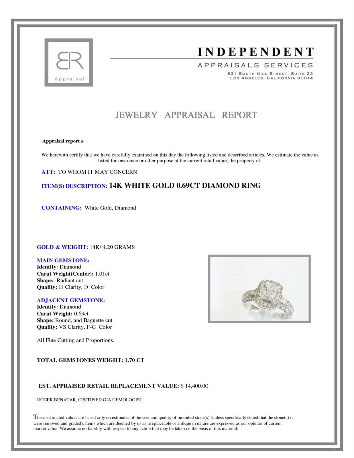 14K WHITE GOLD DIAMOND RING:4.20 GRAMS/DIAMOND SIDES:0.69CT/RADIANT CUT DIAMOND CENTER :1.01CT