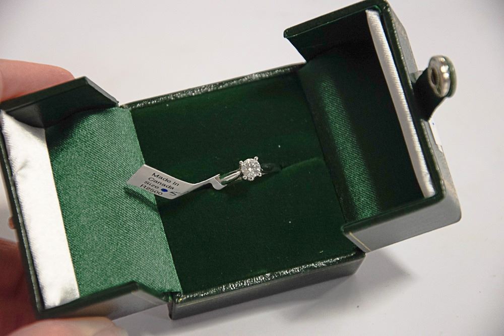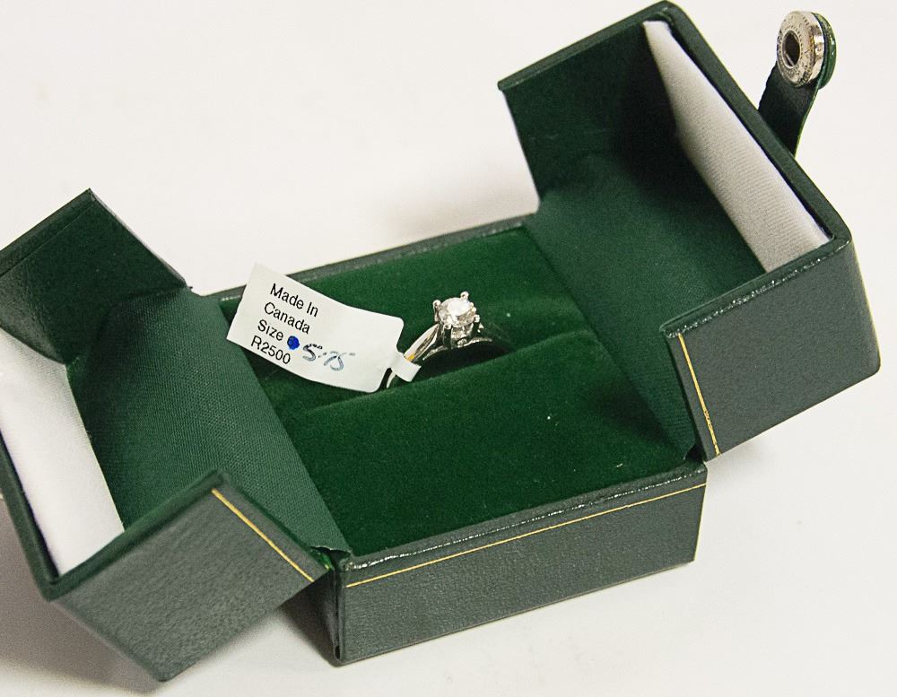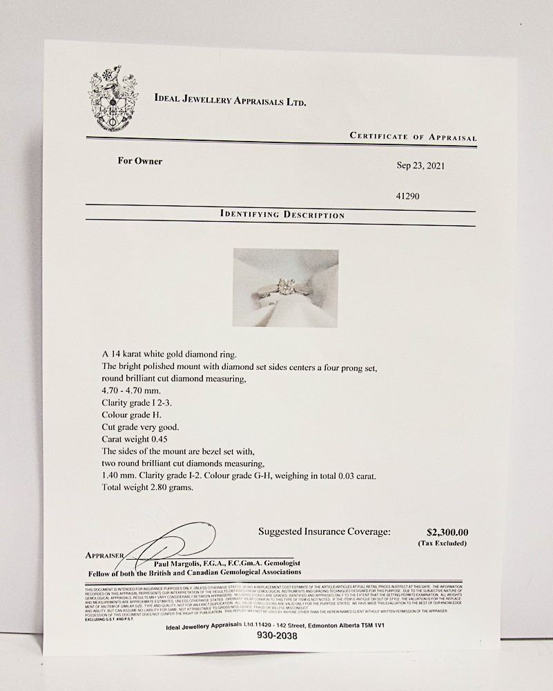 A 14 KARAT WHITE GOLD DIAMOND RING. THE BRIGHT POLISHED MOUNT WITH DIAMOND SET SIDES CENTERS A FOUR PRONG SET, ROUND BRILLIANT CUT DIAMOND MEASURING, 4.70-4.70MM. CLARITY GRADE I 2-3. COLOUR GRADE H. CUT GRADE VERY GOOD. CARAT WEIGHT0.45. THE SIDES OF THE MOUNT ARE BEZEL SET WITH, TWO ROUND BRILLIANT CUT DIAMONDS MEASURING, 1.40MM. CLARITY GRADE I-2. COLOUR GRADE G-H, WEIGHING IN TOTAL 0.03 CARAT. TOTAL WEIGHT 2.80 GRAMS. SUGGESTED INSURANCE COVERAGE: $2300.00.