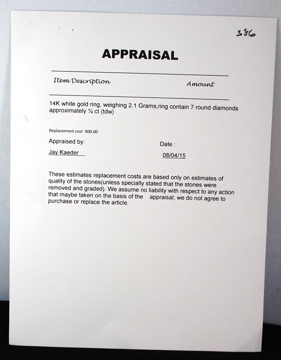 14K WHITE GOLD RING, CONTAINS 7 ROUND DIAMONDS, APPROX. 1/4CTW. THE APPRAISED REPLACEMENT COST IS $900.00. AND THE APPRAISAL COMES WITH IT FOR INSURANCE PURPOSES.
