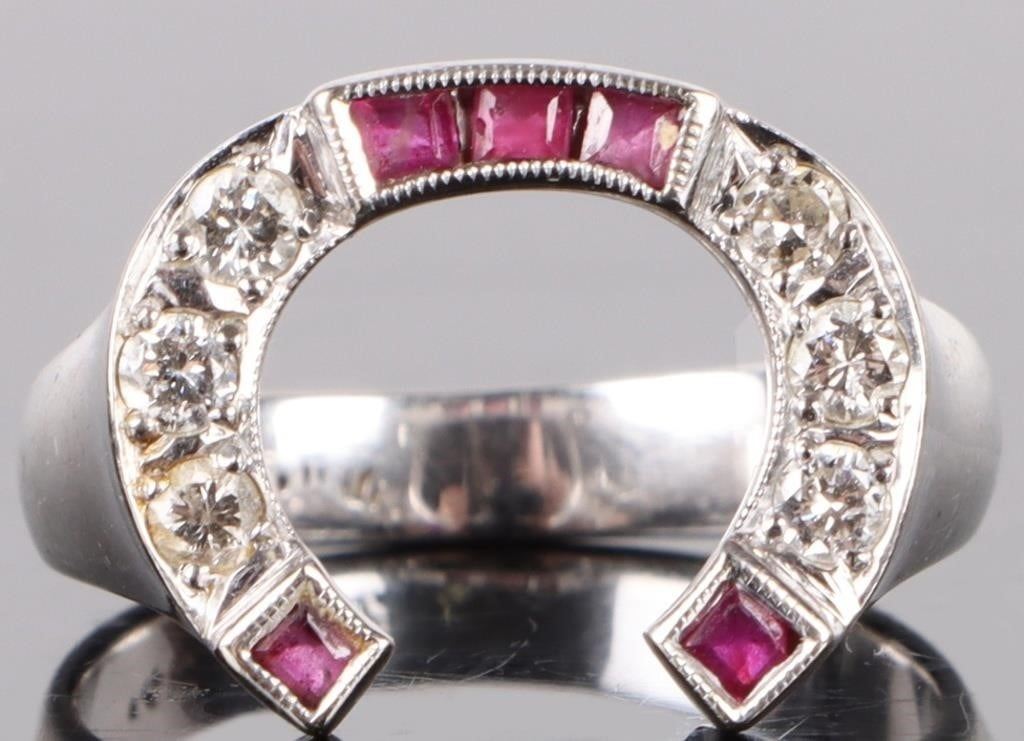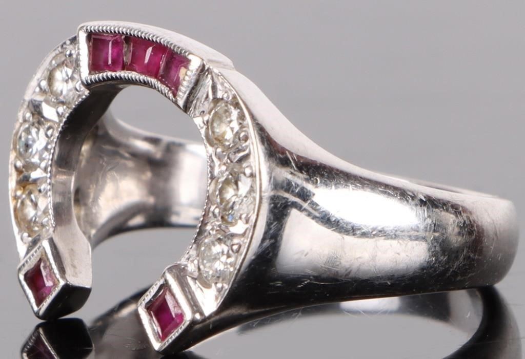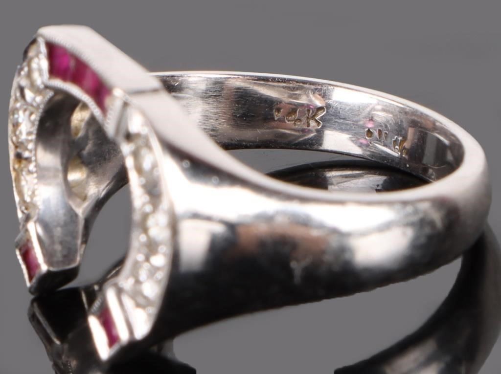 14K white gold diamond & ruby horseshoe ladies ring. Ring has six 0.05ct round diamonds and five 0.02ct inset rubies.