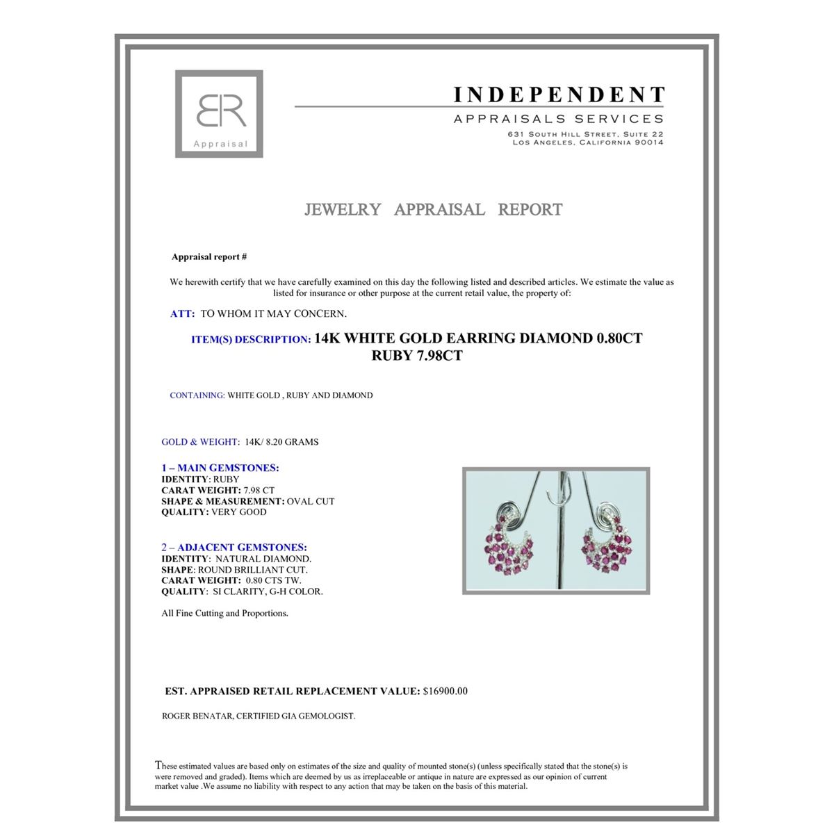 14K WHITE GOLD EARRING 8.20GRAM DIAMOND 0.80CT RUBY 7.98CT