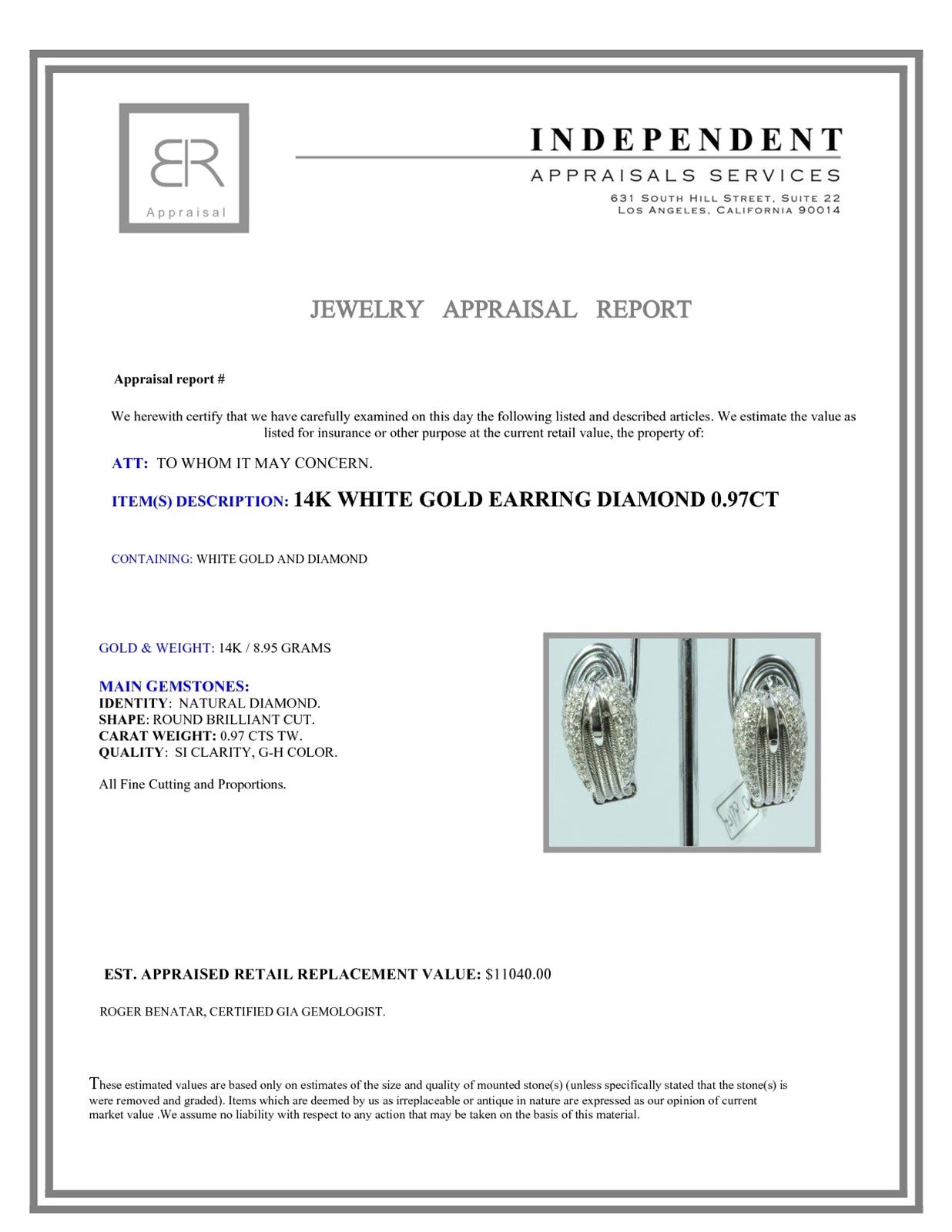14K WHITE GOLD EARRING 8.95GRAM DIAMOND 0.97CT