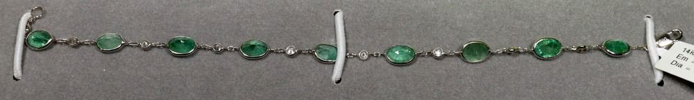9 EMERALDS (6.5CT), DIAMOND (0.14CT) WITH OUT OF PROVINCE COA (COA LOCATED IN LESTERS AREA IN BLUE COA BINDER), SUGGESTED RETAIL VALUE $2,900.00. JEWELLERY.
