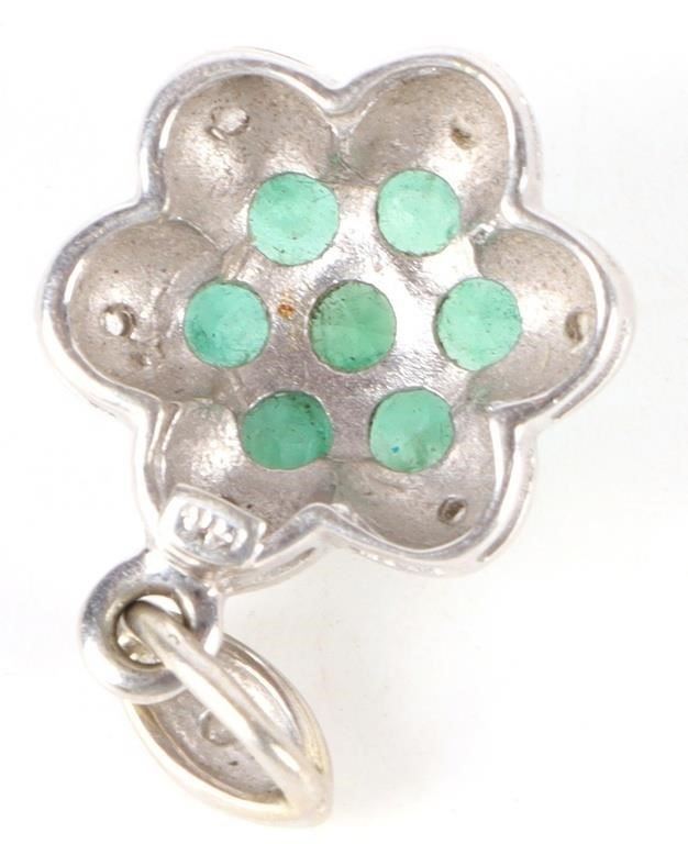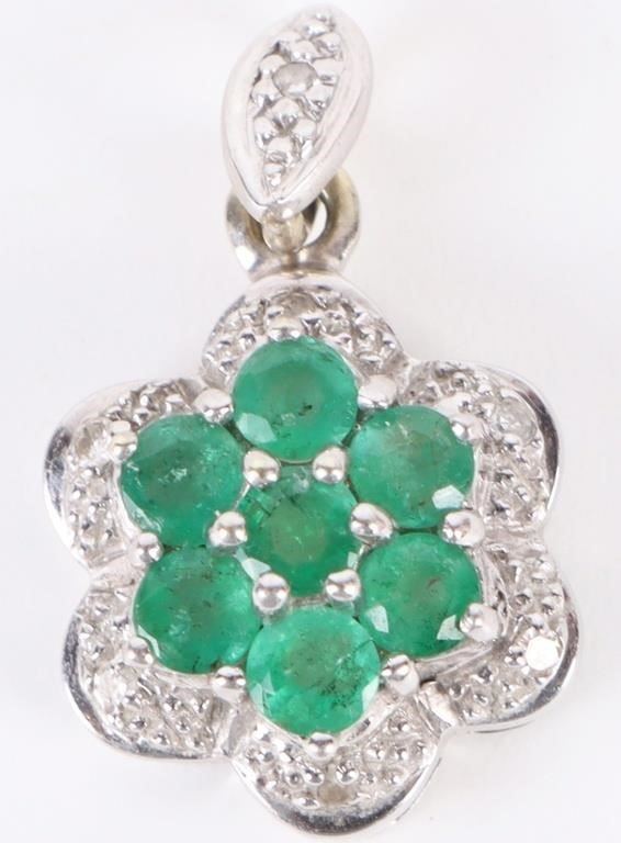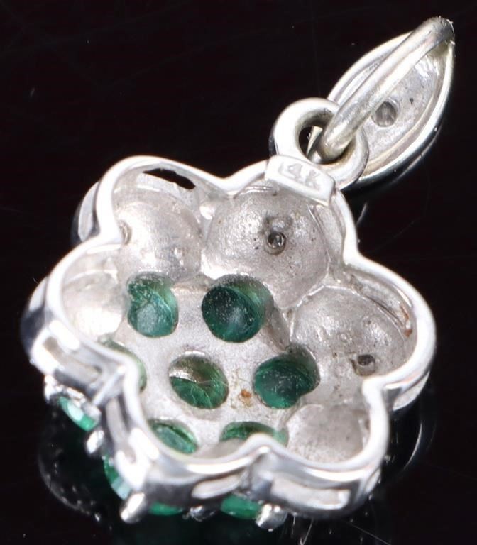 14k white gold emerald diamond floral pendant with seven 0.10ct round emeralds and seven 0.01ct round diamonds.