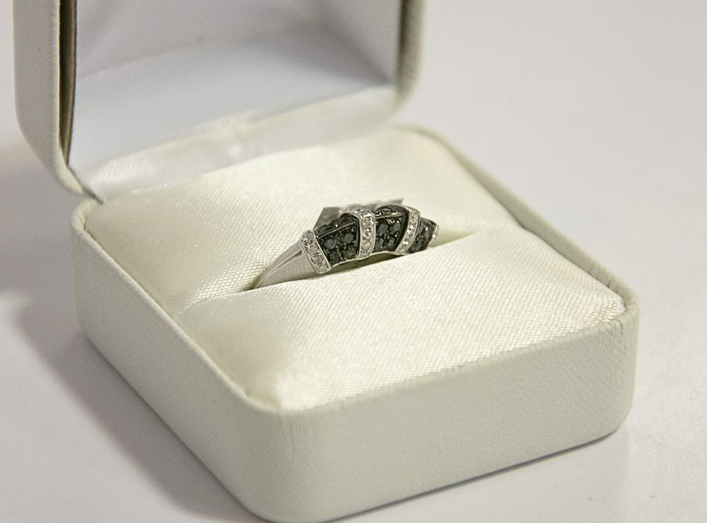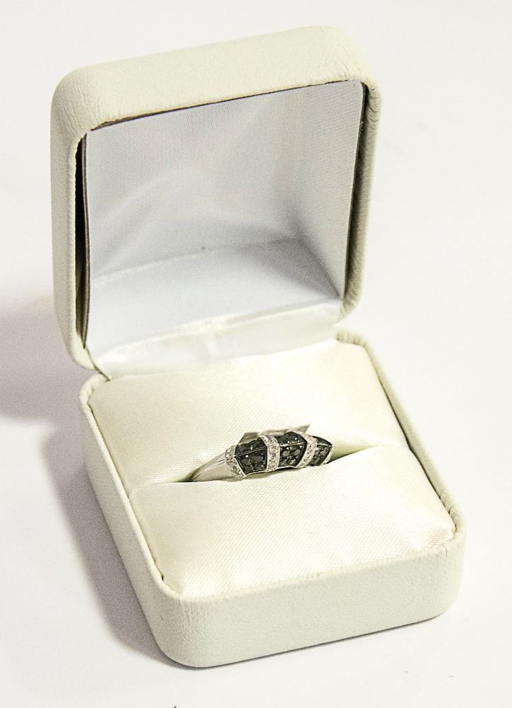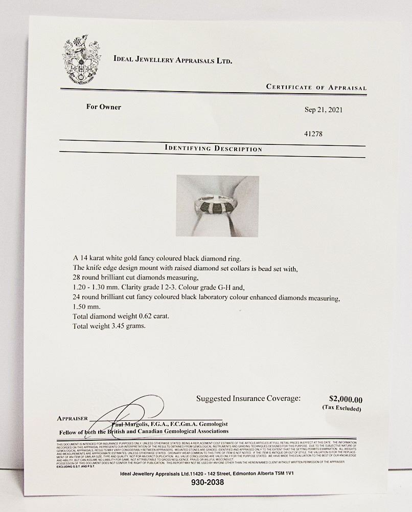 A SIZE: 6 3/4 - 14 KARAT WHITE GOLD FANCY COLOURED BLACK DIAMOND RING. THE KNIFE EDGE DESIGN MOUNT WITH RAISED DIAMOND SET COLLARS IS BEAD SET WITH, 28 ROUND BRILLIANT CUT DIAMONDS MEASURING, 1.20-1.30MM. CLARITY GRADE I 2-3. COLOUR GRADE G-H AND , 24 ROUND BRILLIANT CUT FANCY COLOURED BLACK LABORATORY COLOUR ENHANCED DIAMONDS MEASURING, 1.50MM. TOTAL DIAMOND WEIGHT 0.62 CARAT. TOTAL WEIGHT 3.45 GRAMS. SUGGESTED INSURANCE COVERAGE: $2000.00.