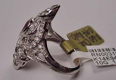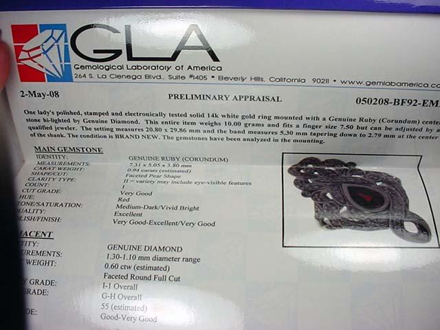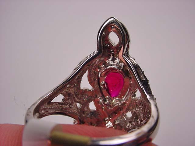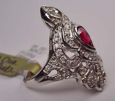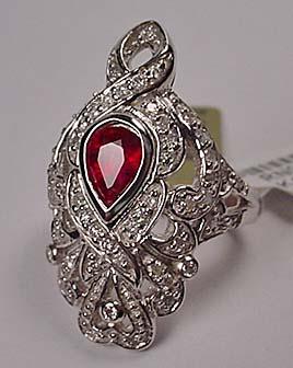 14K WHITE GOLD LADIES DIAMOND AND RUBY RING - Comes with GLA Apprasial of $8,433.00. One pear shaped ruby. 55 round full cut diamonds. Ring size 7.5. Ruby 0.94 ct, Diamonds 0.60 ct, Total weight 10.00 grams.