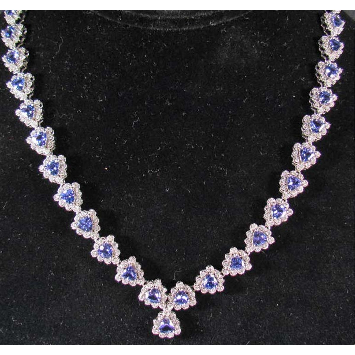 Comes w/ AIG Appraisal of $27,470.00. 43 prong set triangle cut Tanzanites. 387 prong set round brilliant cut Diamonds. Tanzanite 17.62 ct, Diamonds 3.91 cts, Total Weight 37.42 grams.