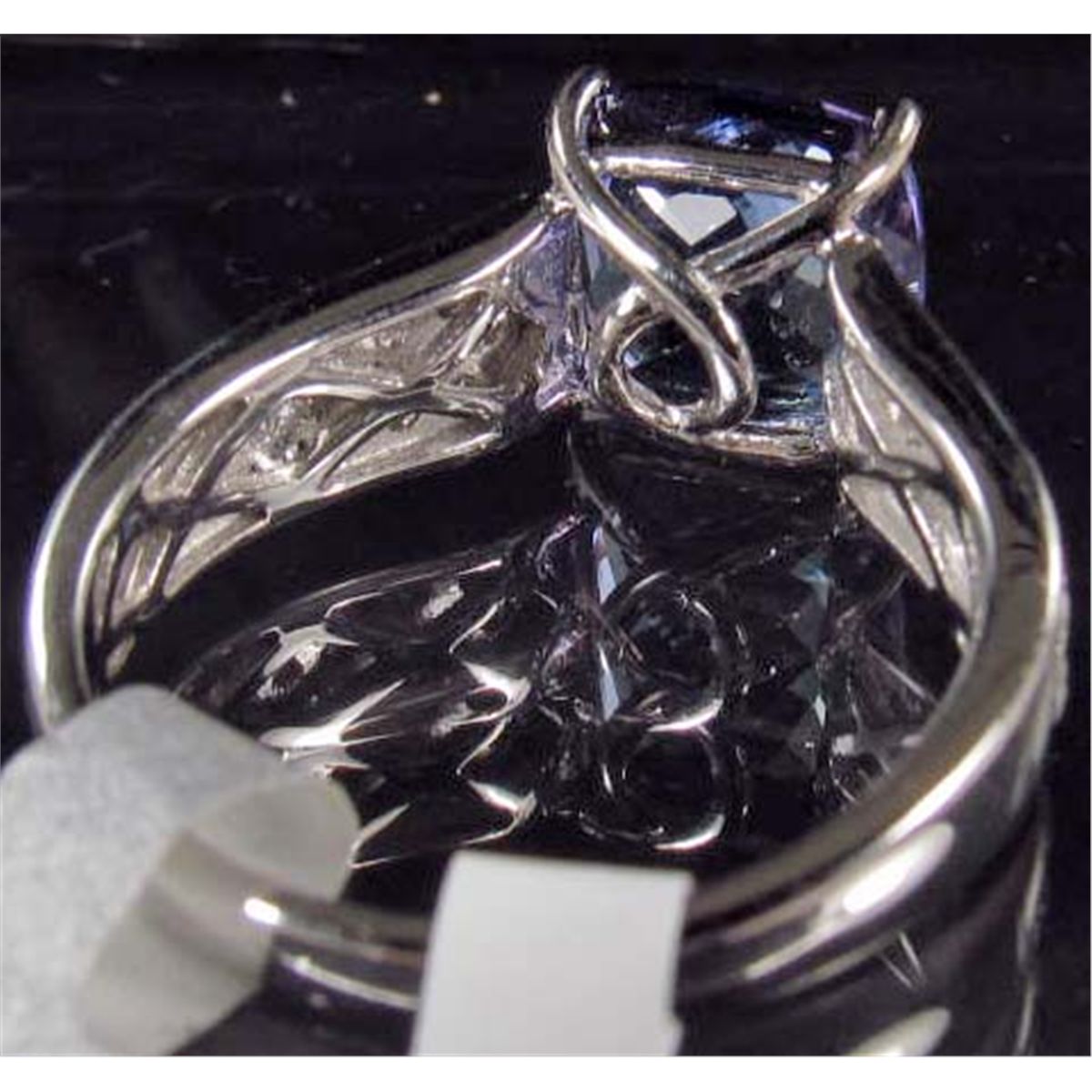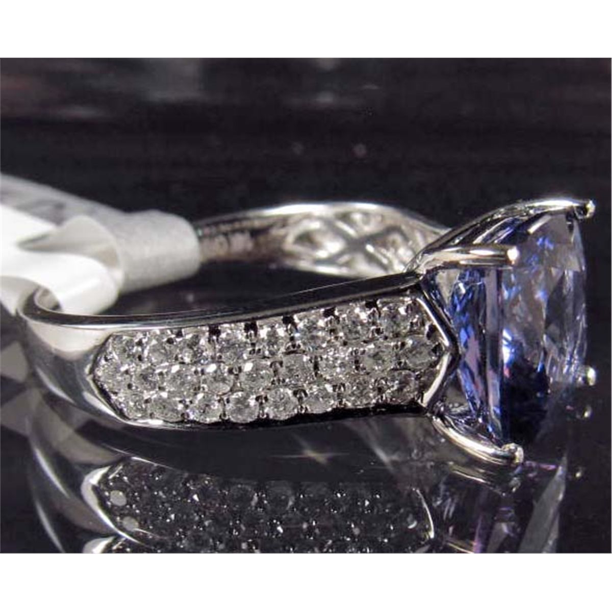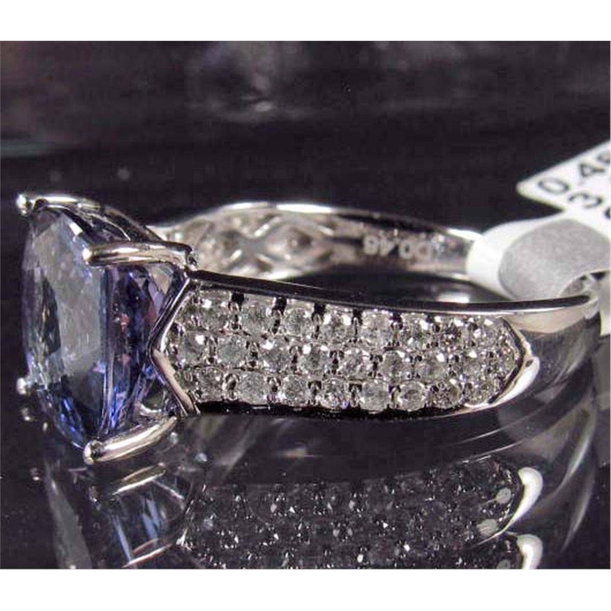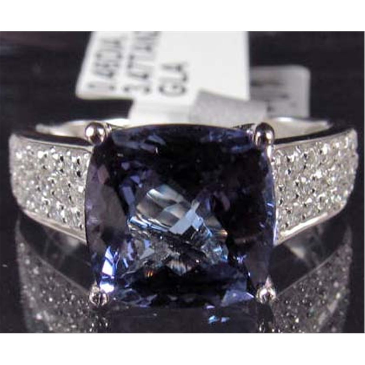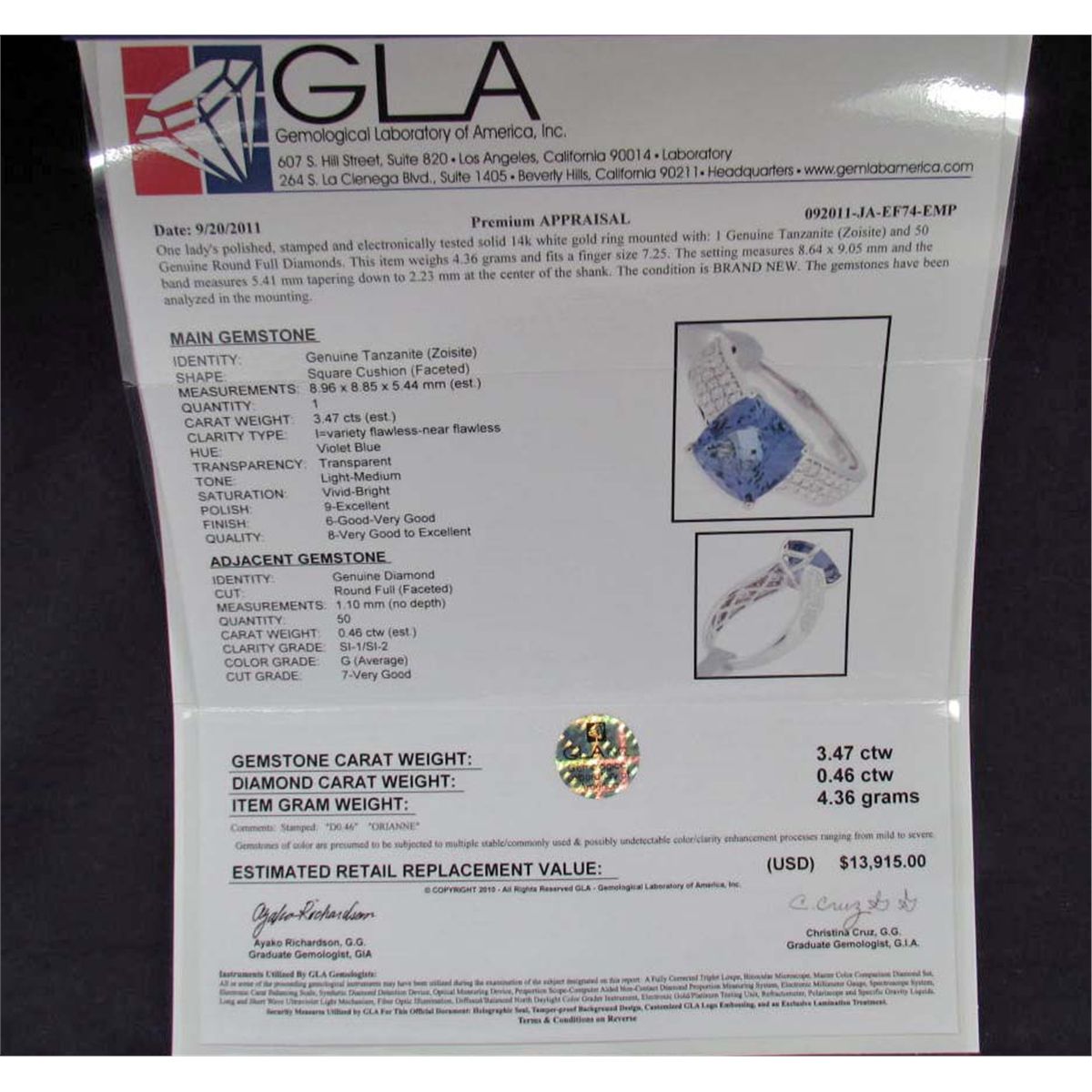 Comes w/ GLA Appraisal of $13,915.00. One square cushion cut Tanzanite center stone. 50 round full cut diamonds. Tanzanite 3.47 cts, Diamonds 0.46 cts, Total Weight 4.36 grams.