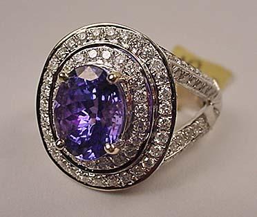 14K WHITE GOLD LADIES TANZANITE AND DIAMOND RING - Comes with AIG appraisal of $11,150.00. One prong set oval mixed cut tanzanite center stone. 141 prong set rouond brilliant cut diamonds. Tanzanite 2.68 ct, Diamonds 1.29 ct, Total weight 8.40 grams.